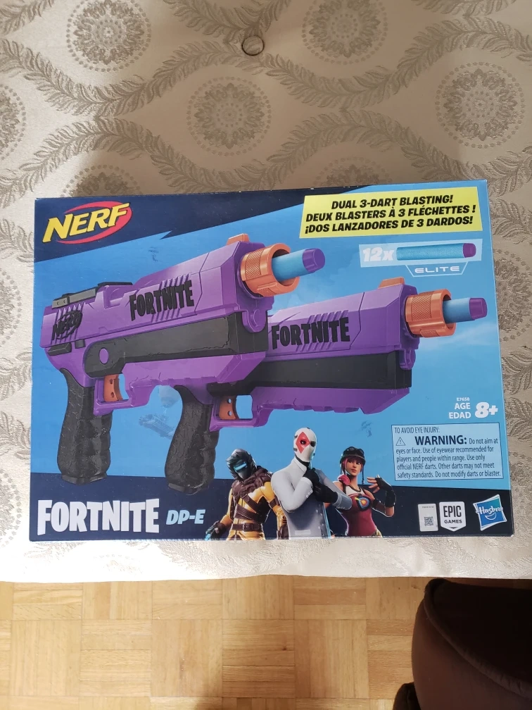 Dual 3-dart blasting. 2-pack of 2. 12x Elite darts. Includes two Fortnite-themed blasters. makes a nice Christmas gift.