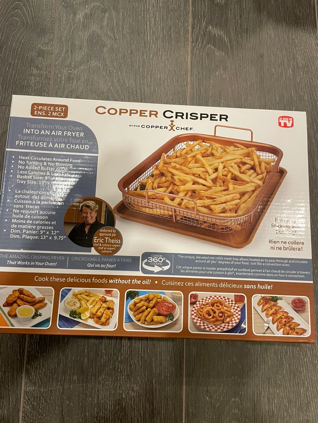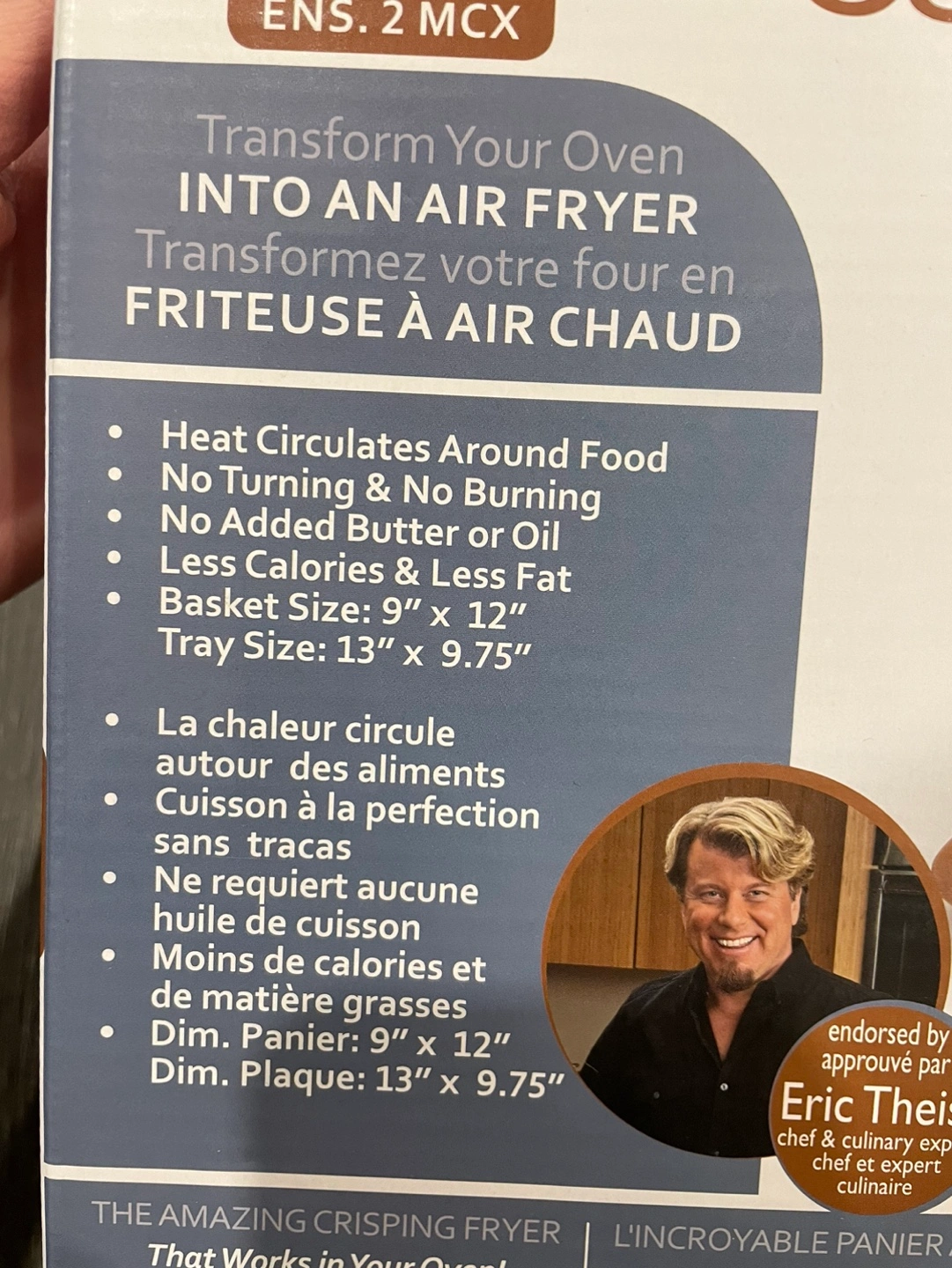 2-Piece set. Transform your oven into an air fryer. Heat circulates around food. No turning and no burning. No added butter or oil. Less calories and less fat. Basket size: 9" x 12". Tray size: 13" x 9.75".