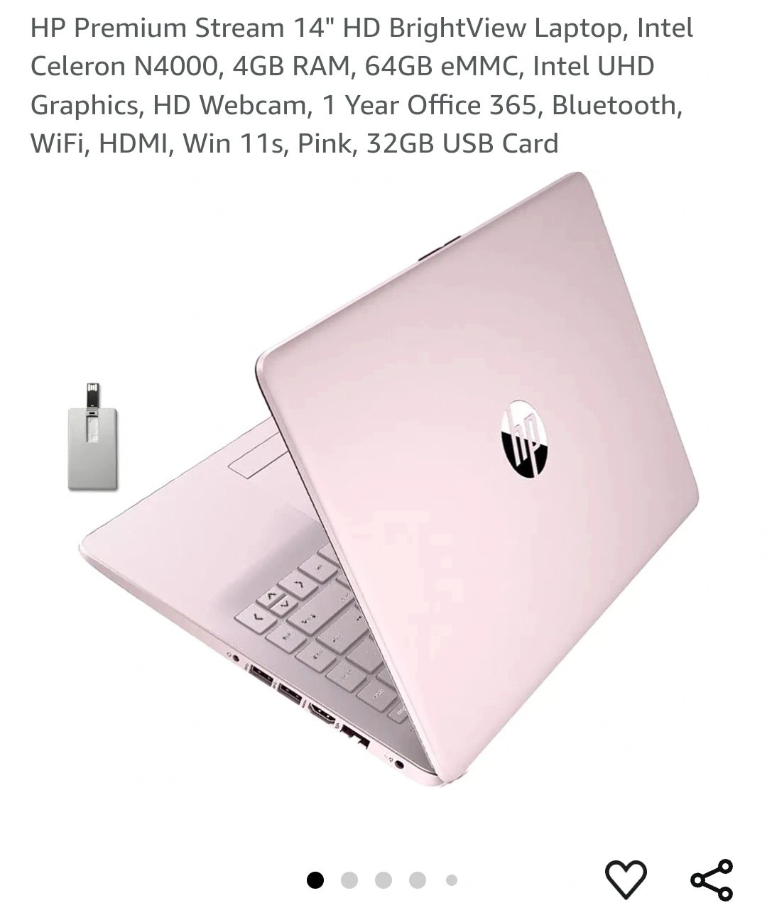 14" laptop, Intel Celeron N4000, 4GB RAM, 64GB eMMC, Intel UHD Graphics, HD Webcam, 1 Year Office 365, Bluetooth, WiFi, HDMI, Win 11s, Pink. Brand new, used maybe a handful of times. I already have 2 other laptops, so I didn't end up needing this. Works fine.