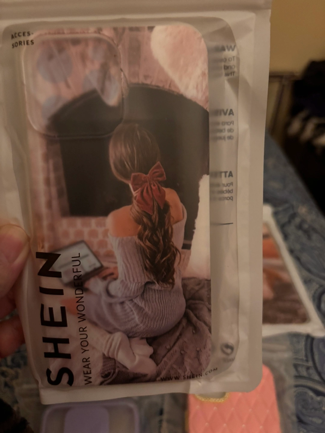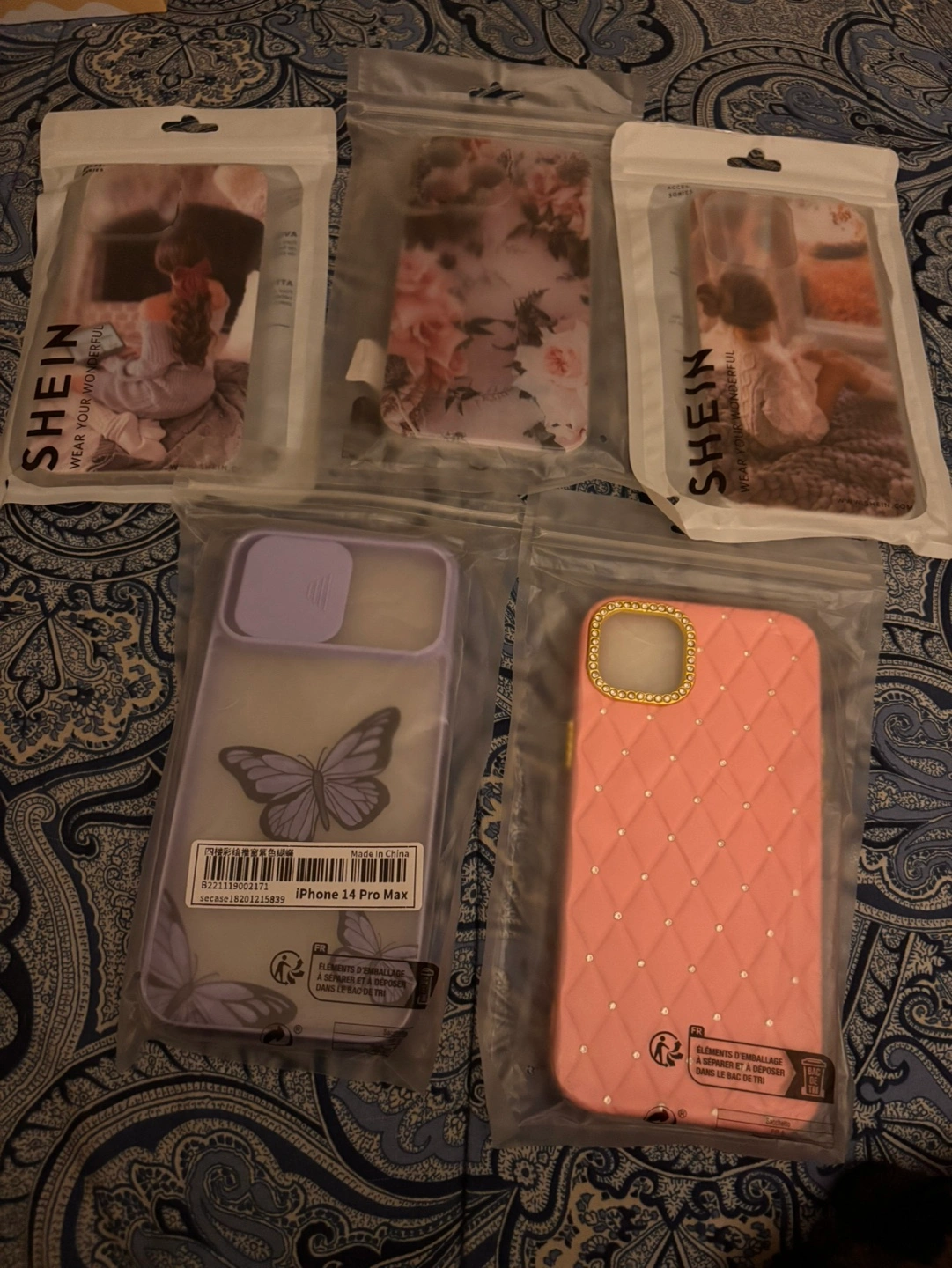 Five brand new iPhone 14 Pro Max cases. Four cases are from Shein. One case has a butterfly design and a clear back with a purple camera cover.