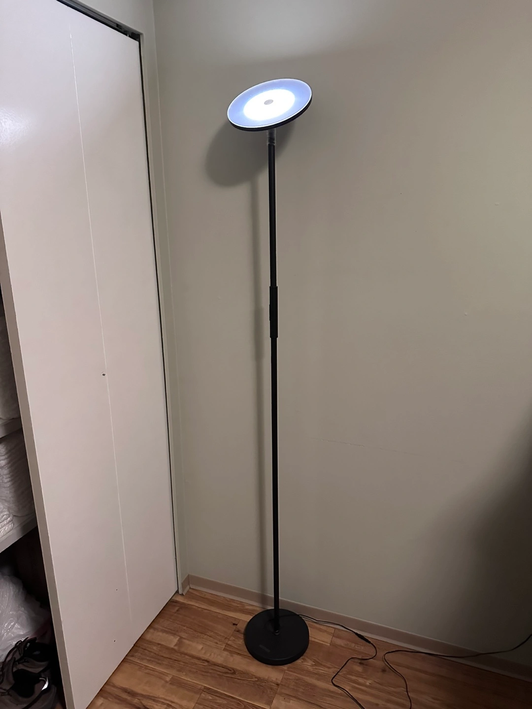 Floor lamp, model FL33. Features a touch switch, power button, and uniform lighting. About 5’ 10” long. New in box.