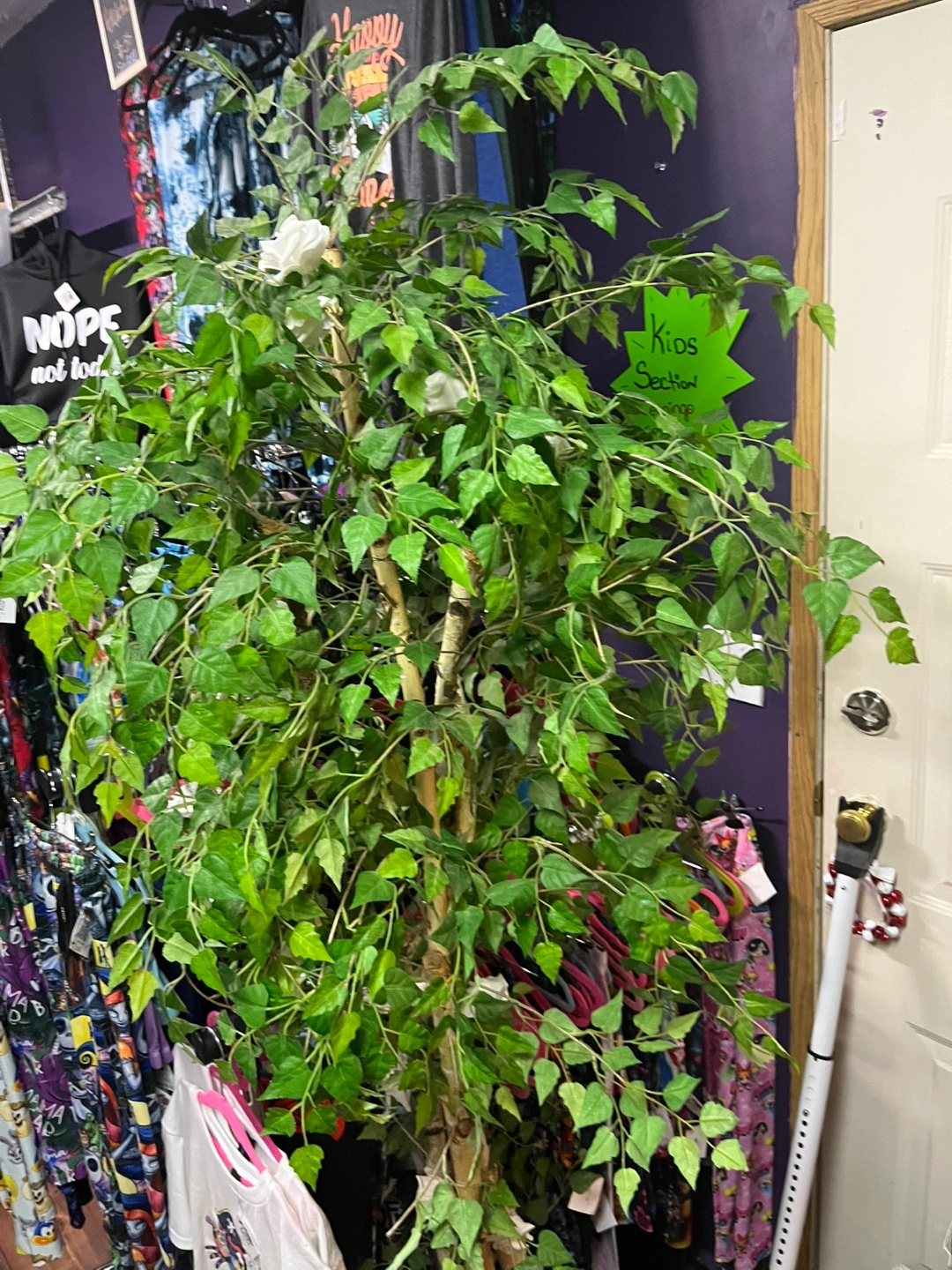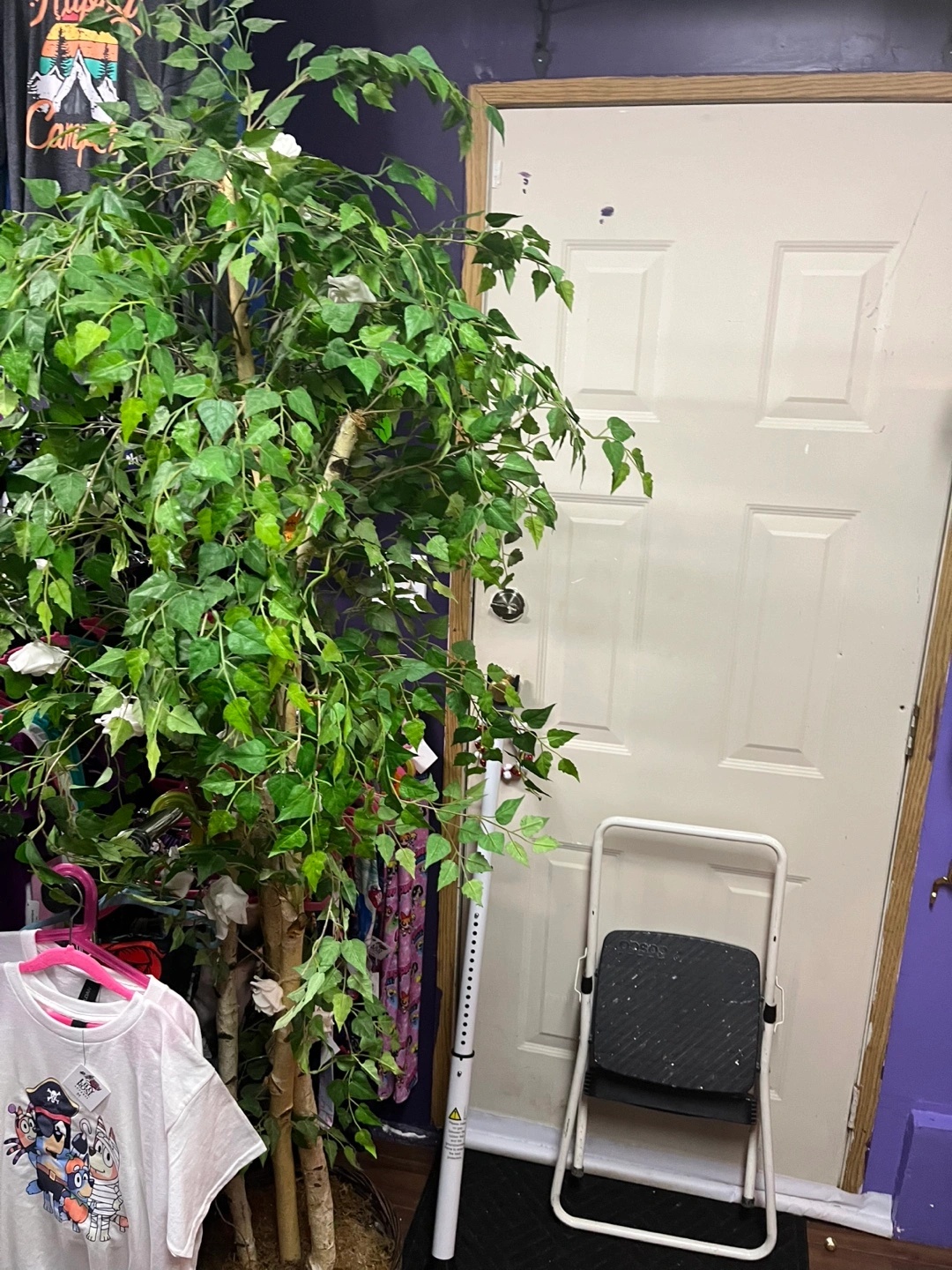 Large artificial tree. Green leaves and white flowers. Tall and narrow. Perfect for adding some greenery to your home or office. flowers are battery and change colours Just over 6ft No longer needed Porch pu 227th Abernathy Way Maple Ridge