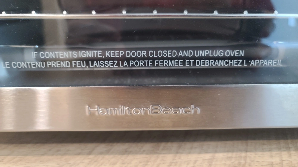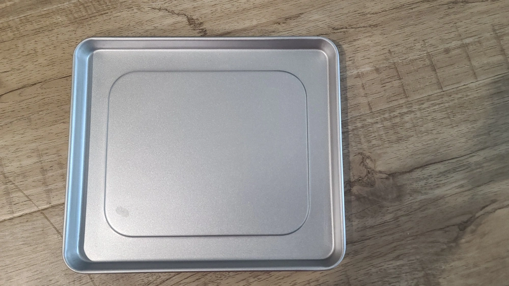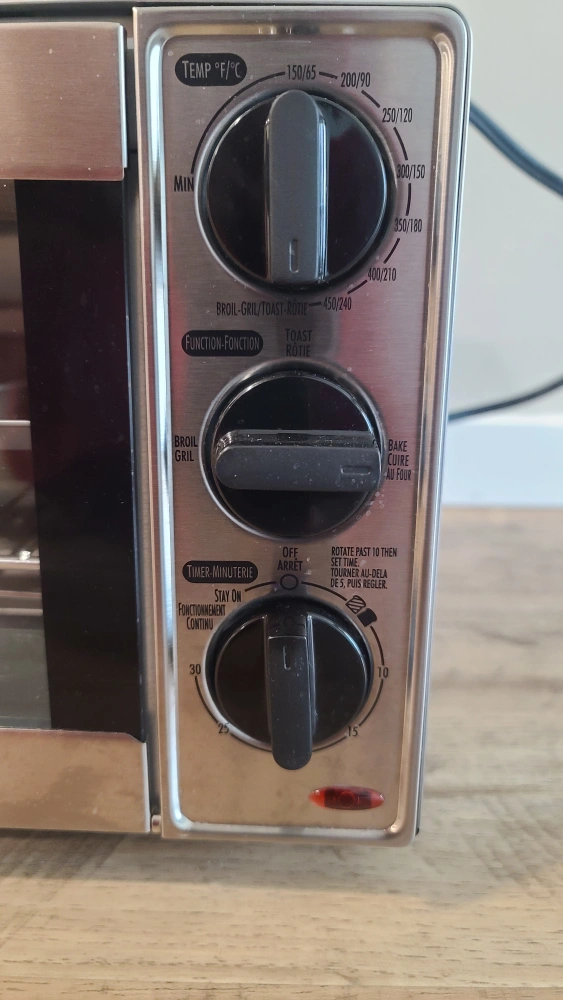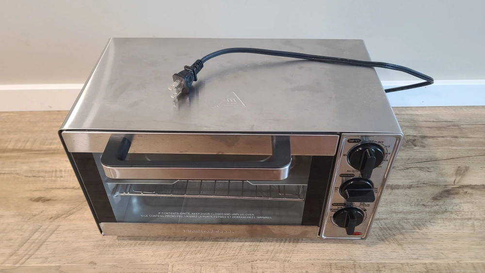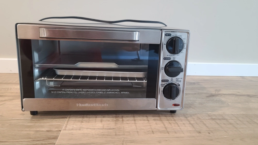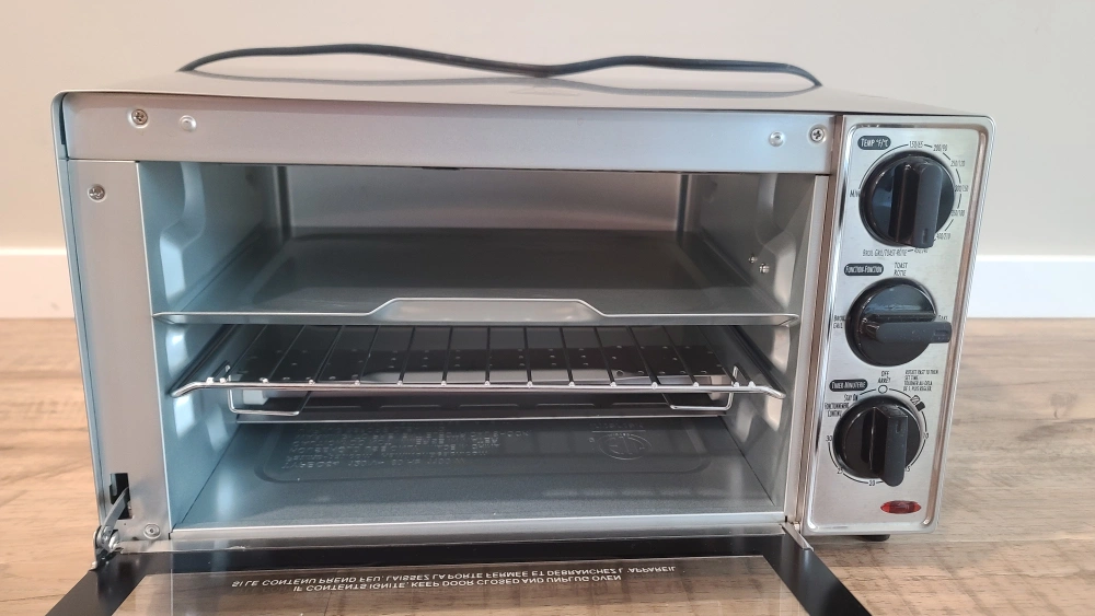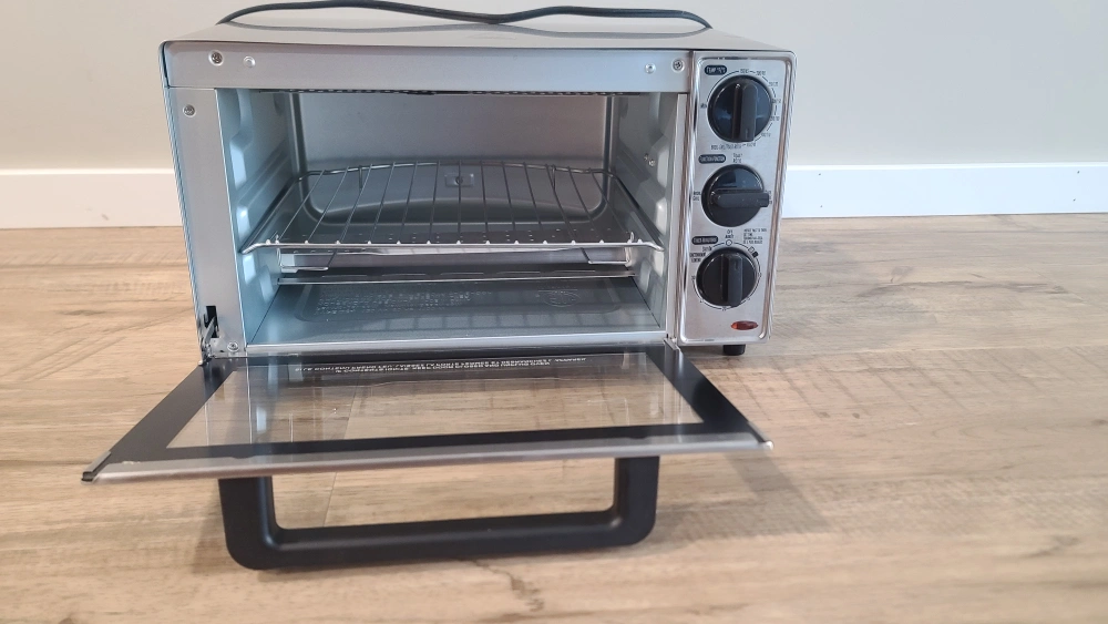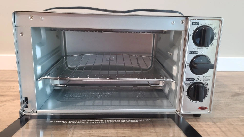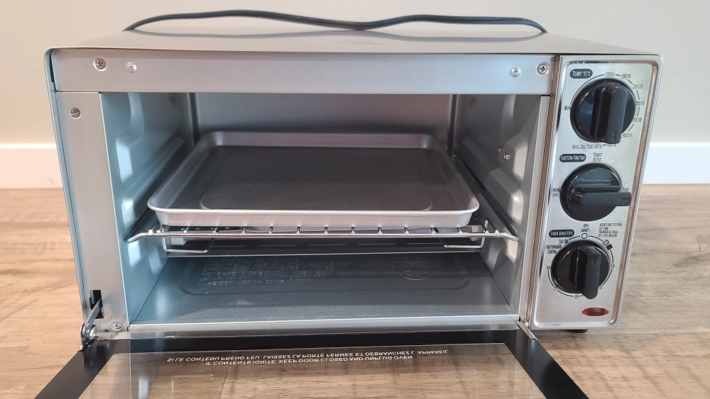 Small countertop toaster oven. Includes baking pan and wire rack.