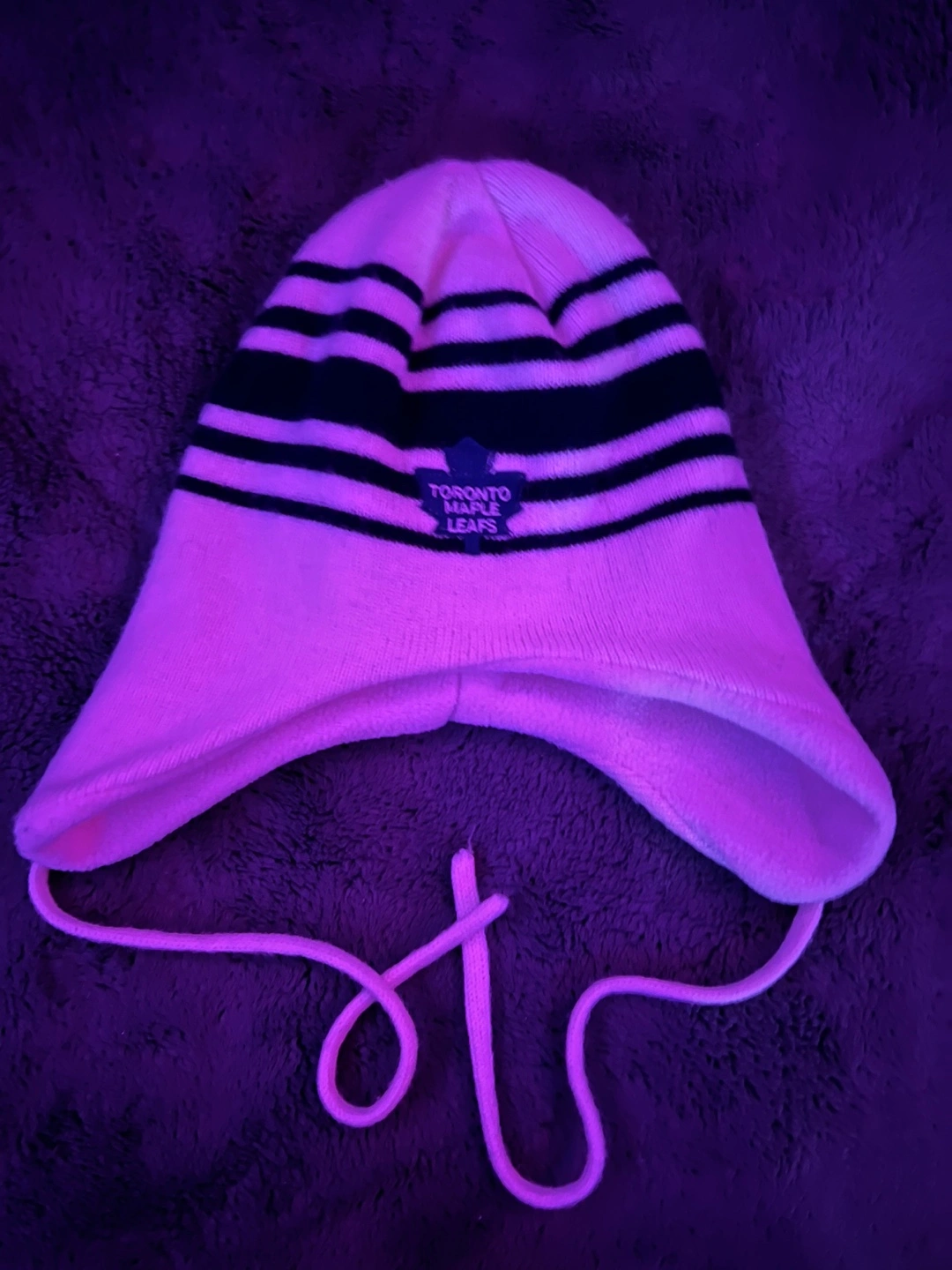 White and black striped toque with a Toronto Maple Leafs logo. Has a white drawstring.