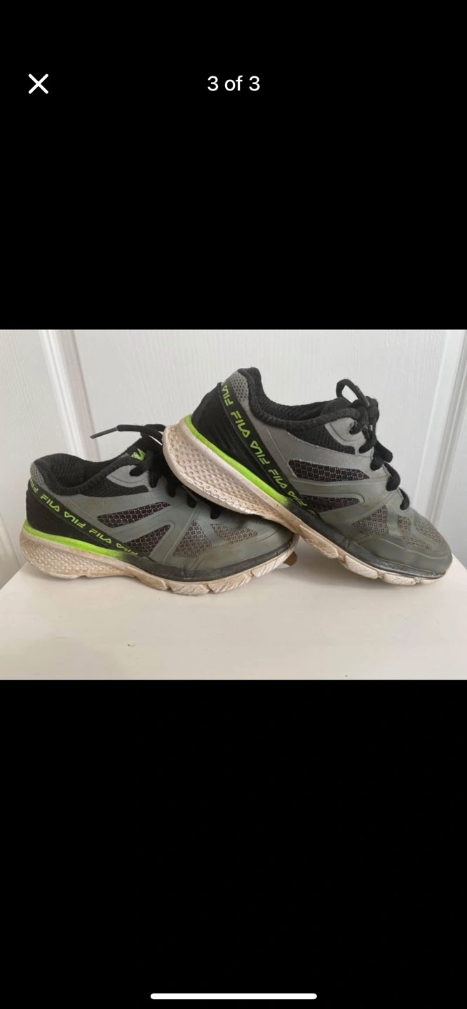 Gray, black, and neon green running shoes. Treads are still in great condition. Pick up Bayview and Sheppard.