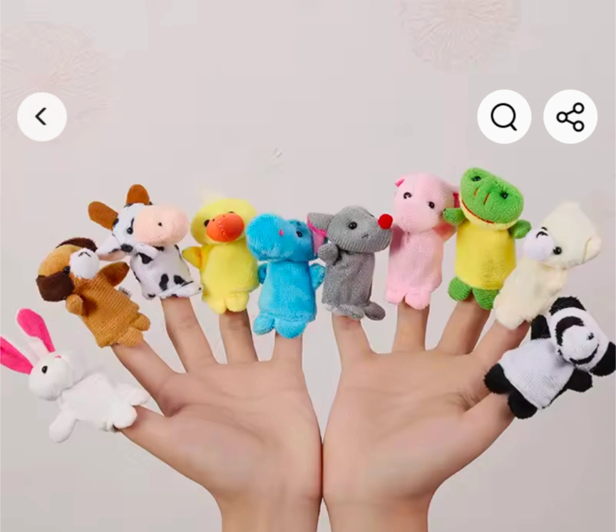 Set of 10 finger puppets. Various animals. Soft plush material. Great for kids.