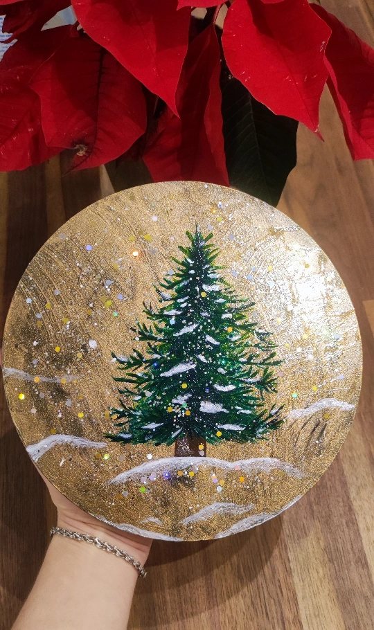 Hand painted Christmas tree on a wooden round. Features a gold background and white snow with glitter.