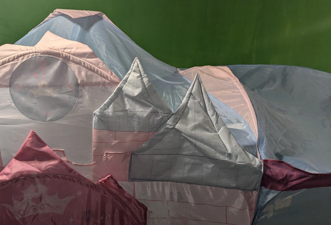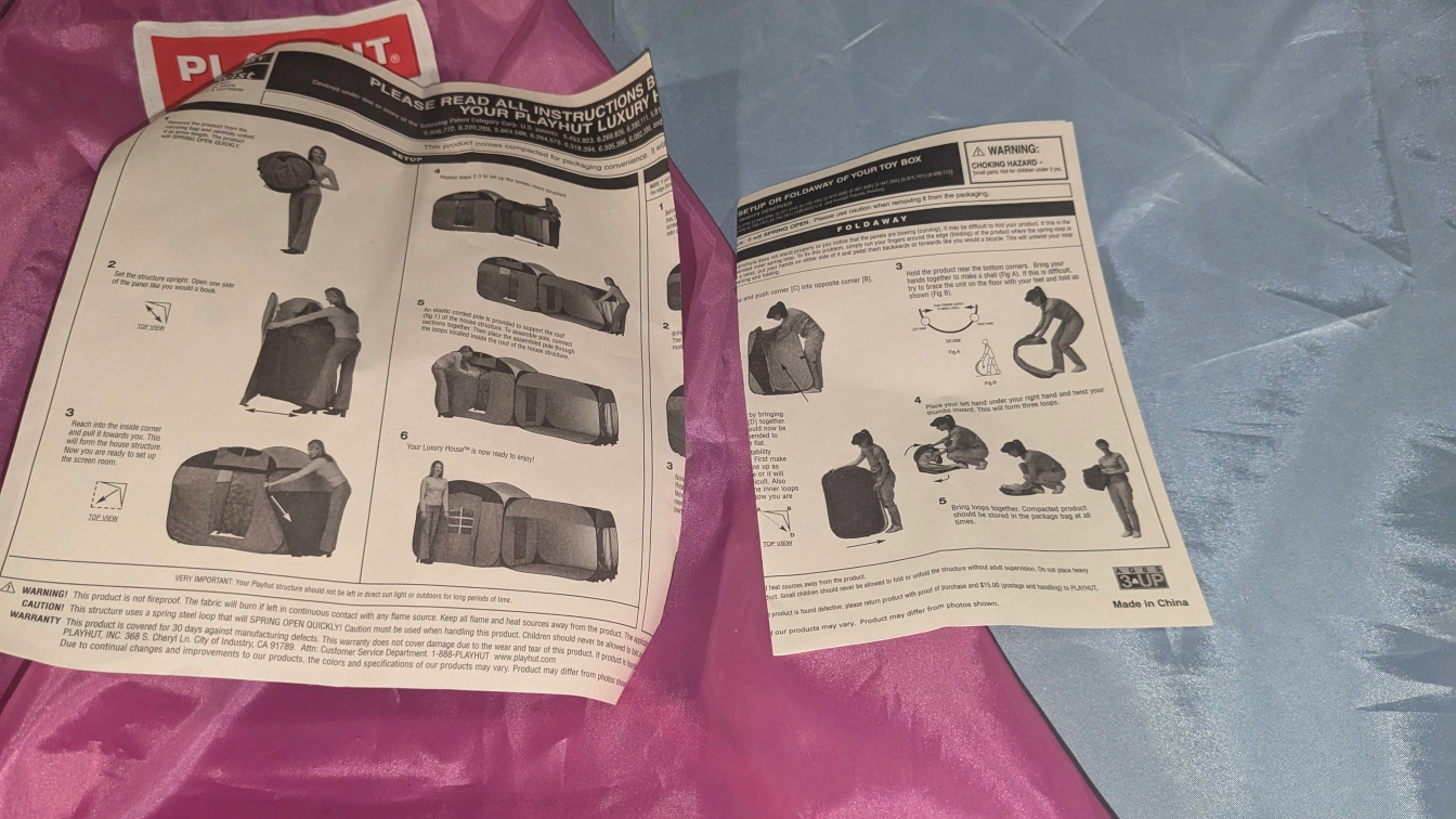 Huge Princess Play house or tent Can can be used indoors or outdoors. This Cinderella playhut is truly GIGANTIC. I cannot back up far enough to take a photo of the entire thing. I also do not have enough room in my house to stretch out the entire playhut to extend the roof. There are five exit points in the play hut. Sometimes I only set up half of the play hut or 3/4 of it. That is the beauty of playhut design. You don't need to set up the entire structure as the interior bendable tent like spines allow for partial setup and still provide spacious room to play inside. EZ-TWIST Simple Fold Design This one measures 9.5 feet long by 5 feet wide by 5 feet tall This is very rare and hard to find. We truly hope that your child or children enjoy this every bit as much as mine did. This is a trademark toy from Walt Disney Corporation. This is Cinderella Special Edition. There are two doors, both with pink screens. One door is covered by a padded Cinderella door. Two other walls have large screened open Windows. A fifth wall has a secret round open exit. Also included is: - a Cinderella fridge. - A Cinderella toy chest. -A Cinderella stove. My ( boy & girl) children have had more fun than I could ever describe inside of this giant Cinderella Castle. They had tea parties and dinner in here. They went on secret spy missions. They flew into space. They defeated many bad villains .They read stories for hours. They took naps in here. They had sleepovers in here. Their grandfather paid several hundred dollars for this Cinderella special edition Castle. This is made by Playhut. It folds flat just like a CAMPING TENT. It fits inside the pink bag. Therefore, once you learn how, all of it stores away in a flat neat bag From a smoke-free home. We are happy to answer any questions you may have. Thank you for looking at our listing