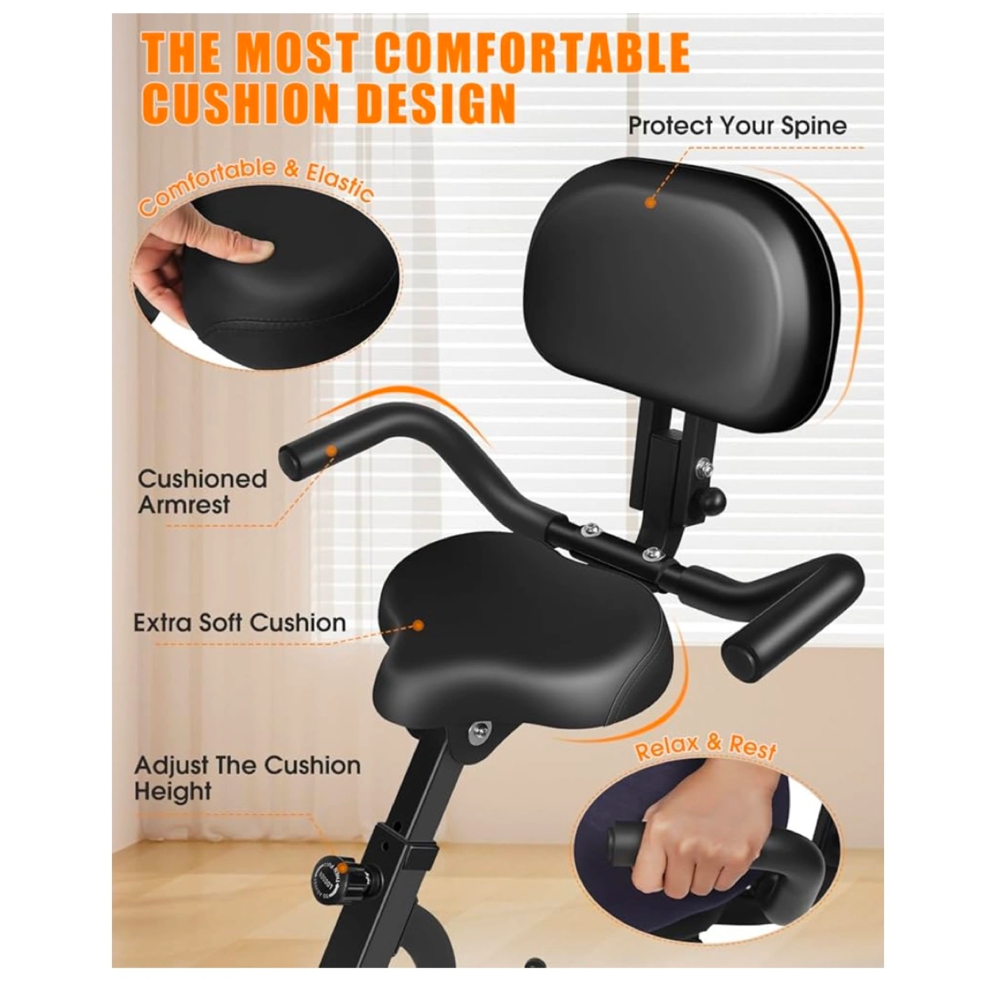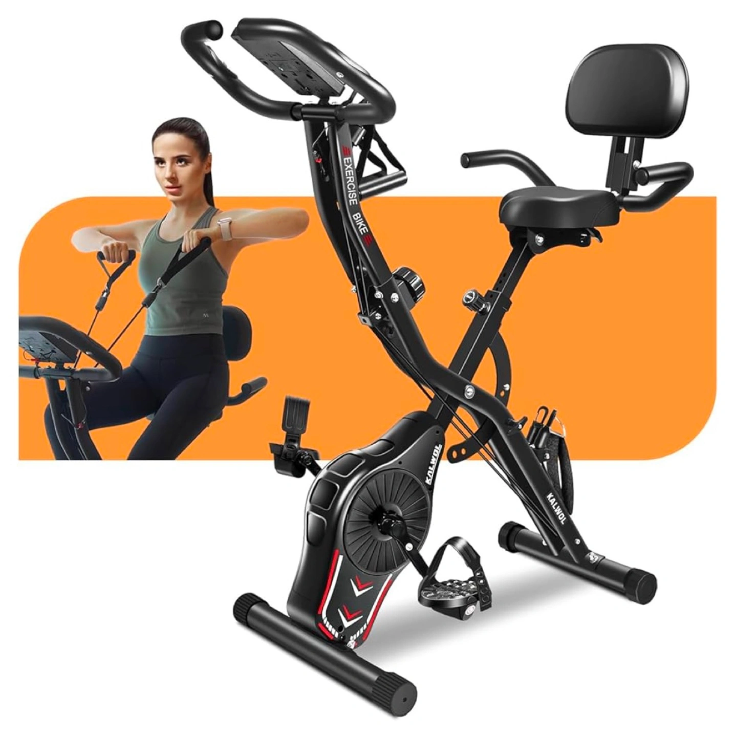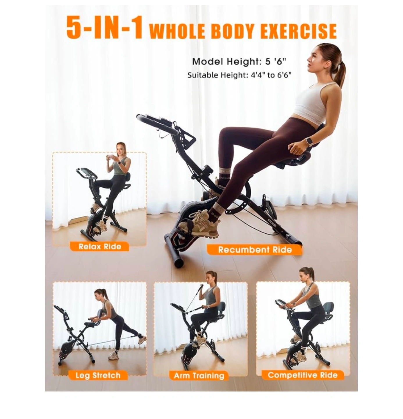 Folding exercise bike with adjustable seat and armrests. Includes resistance bands for upper body workout. Offers multiple riding positions: upright, recumbent, and competitive.