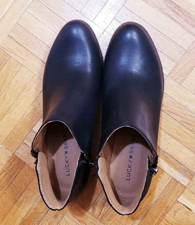 Classic can be trendy with the Blandre ankle bootie by Lucky Brand. * These boots are made of leather uppers with synthetic lining for comfort. * They have a pull on design with side zip closure and an almond toe. * The block heel measures 1.5" in height and the shaft measures 4". * Casual/formal comfortable pick up at my place or Islington Station