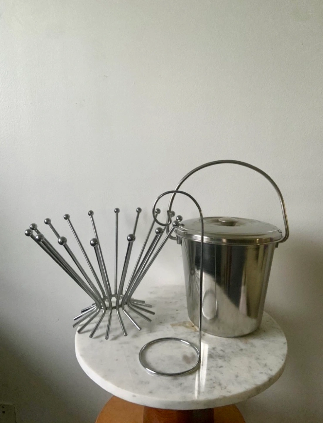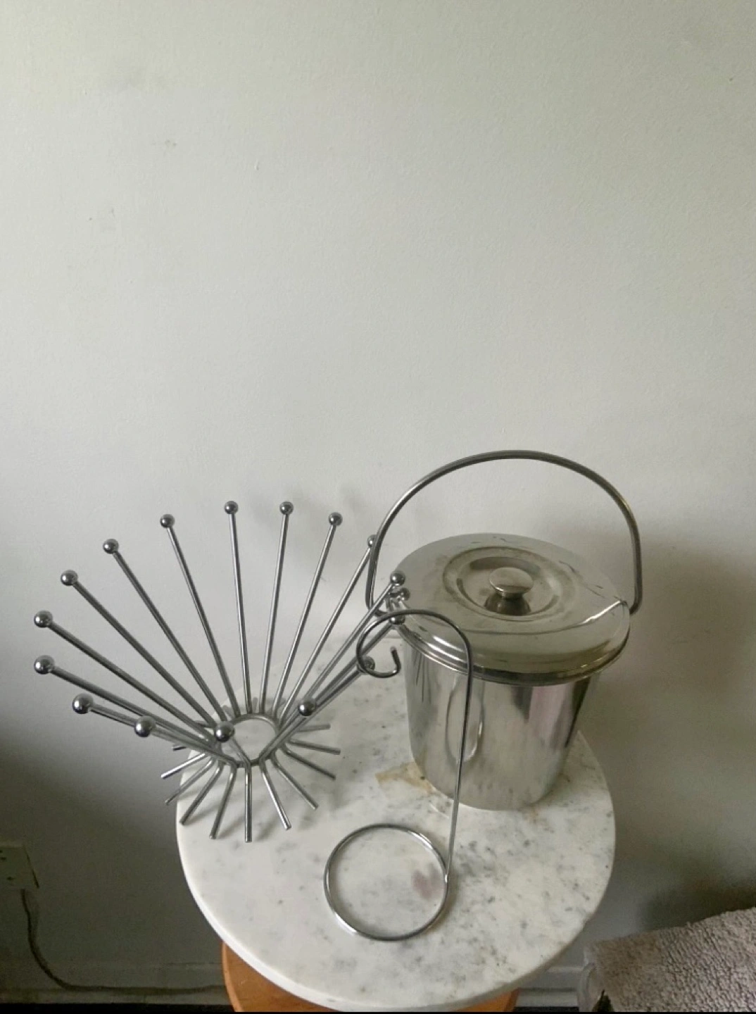1. Vintage Stainless steel ice bucket with lid and handle. Excellent condition. 2. Vintage Beautiful Metal fruit bowl 3. and paper towel holder ▶️Price firm ▶️pick up only and final sale ▶️exact cash payment. ▶️kindly respond when ready to purchase and pick up.