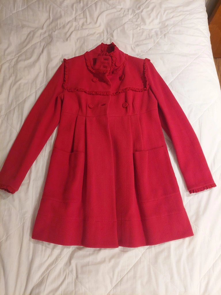 DVF Red coat with a ruffled collar, pockets, and a button closure. The coat is fully lined. Like new only worn a few times. wool and cottom coat with silk lining.