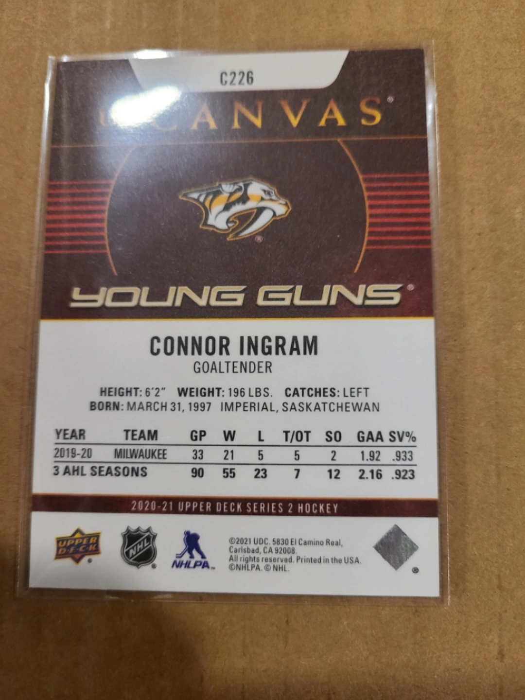 Connor Ingram Young Guns Canvas card. Numbered C226. From the 2020-21 Upper Deck Series 2 Hockey set.