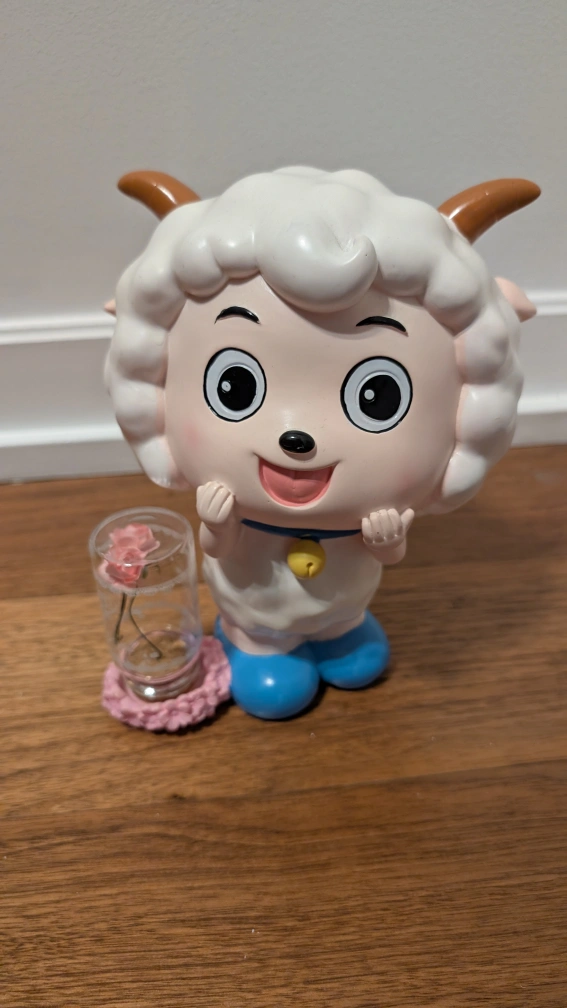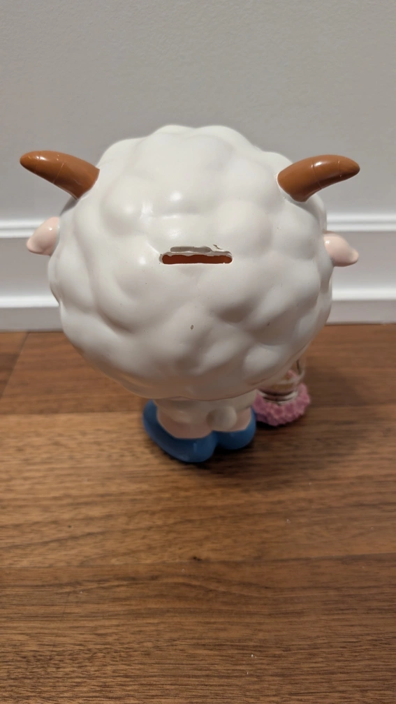 White sheep piggy bank with a coin slot on the back. Includes a glass vase with a pink rose.