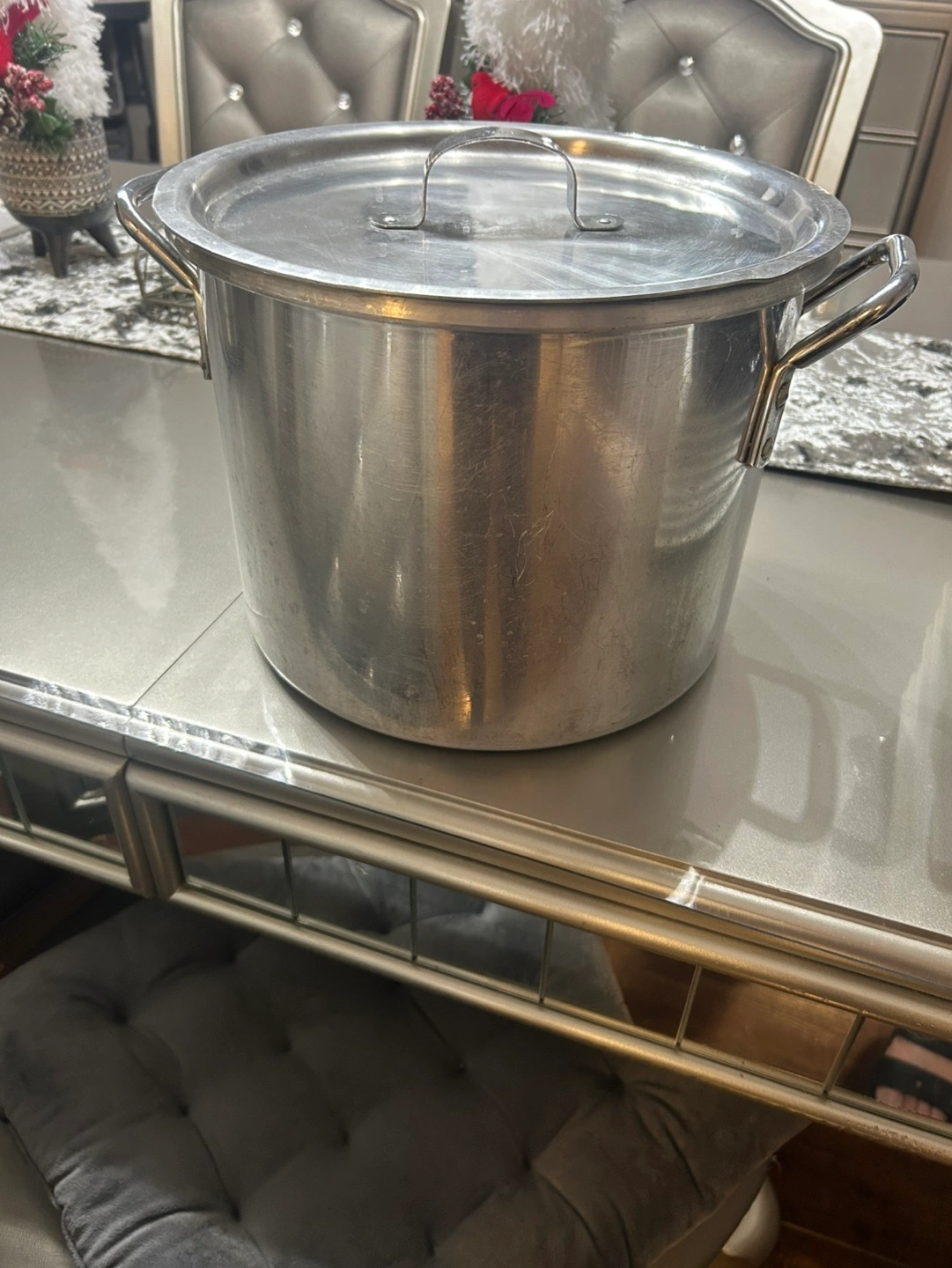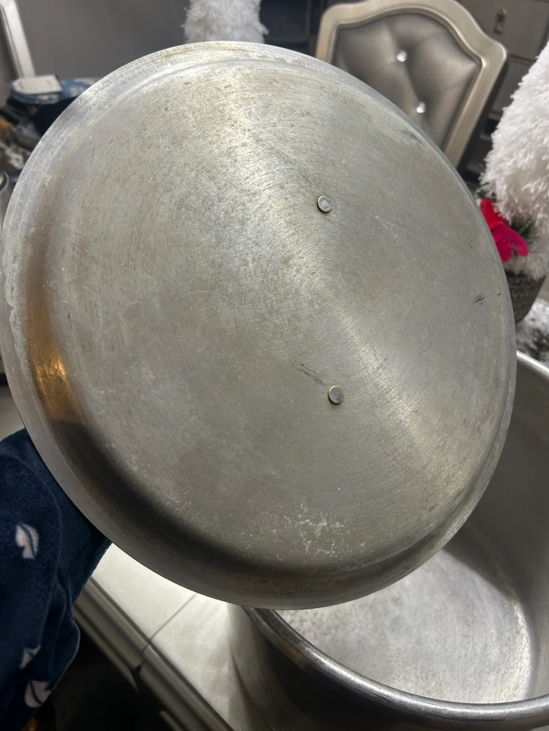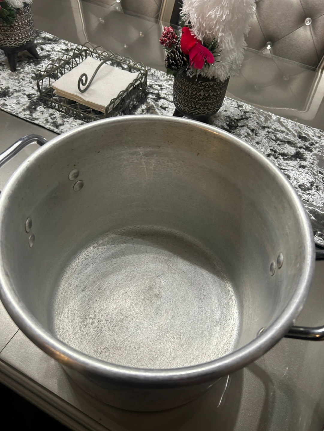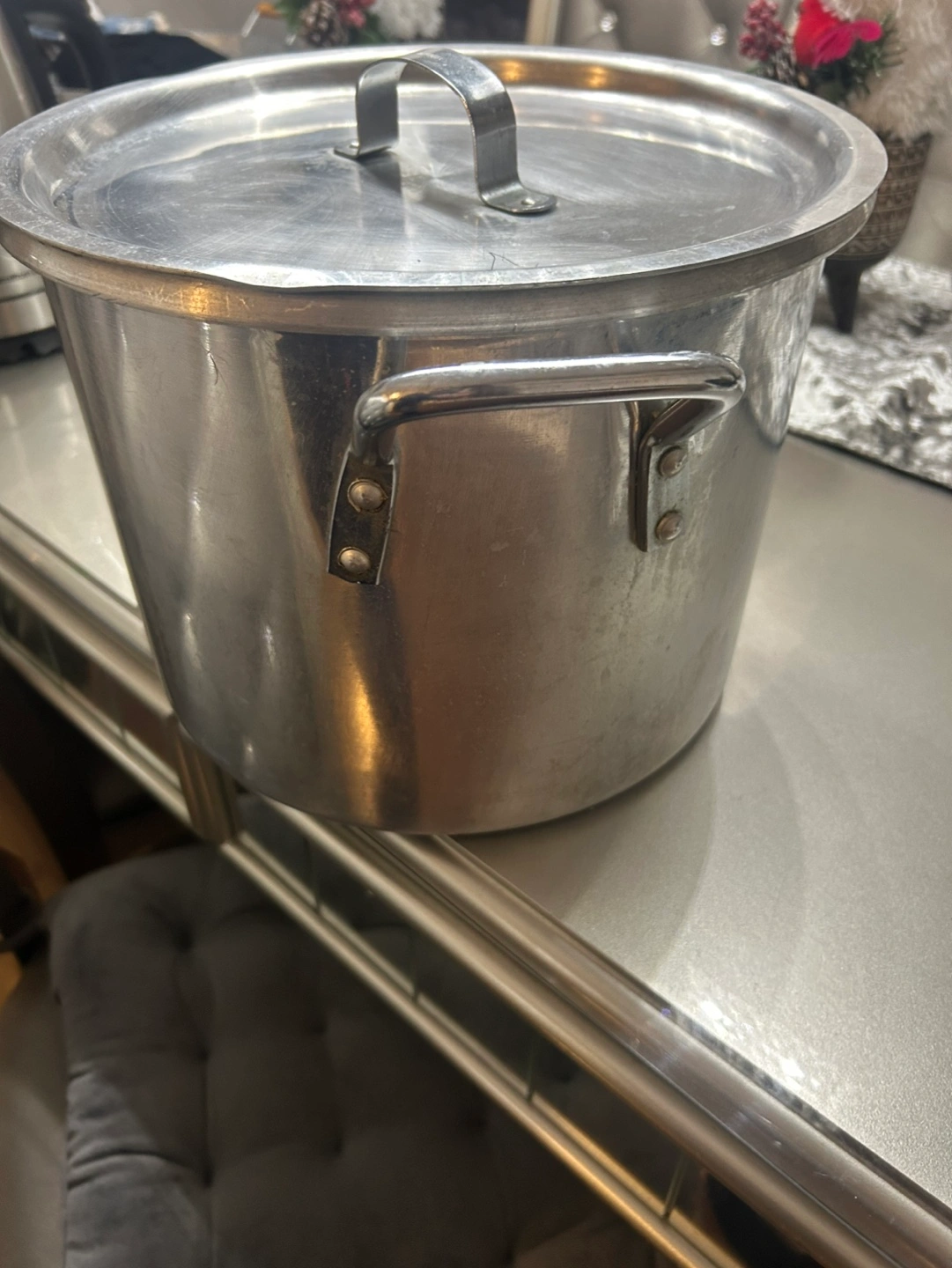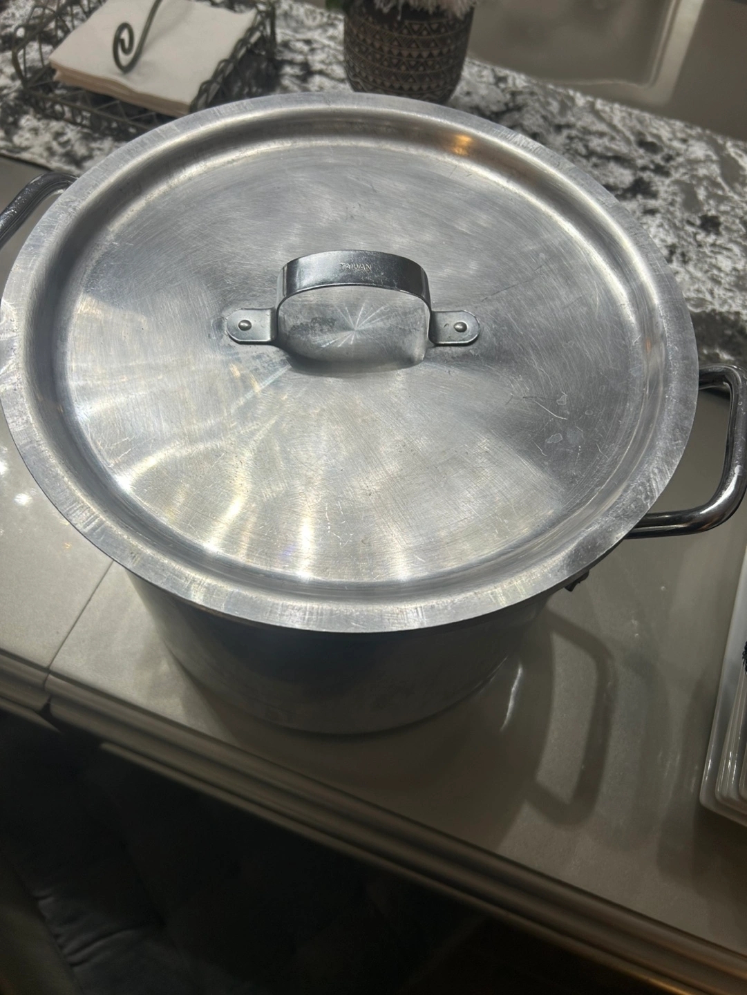 Large aluminum pot with lid. Great for cooking large meals or for canning.