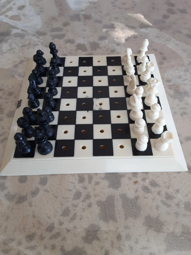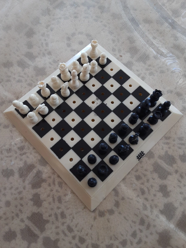 Vintage travel chess set. Compact and portable. All pieces included. Good condition. Measures 5" x 5".