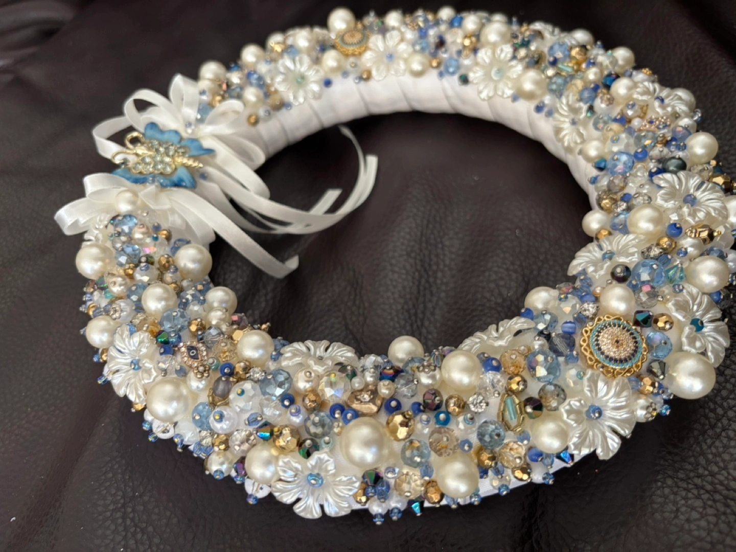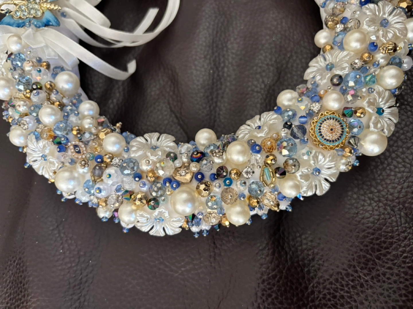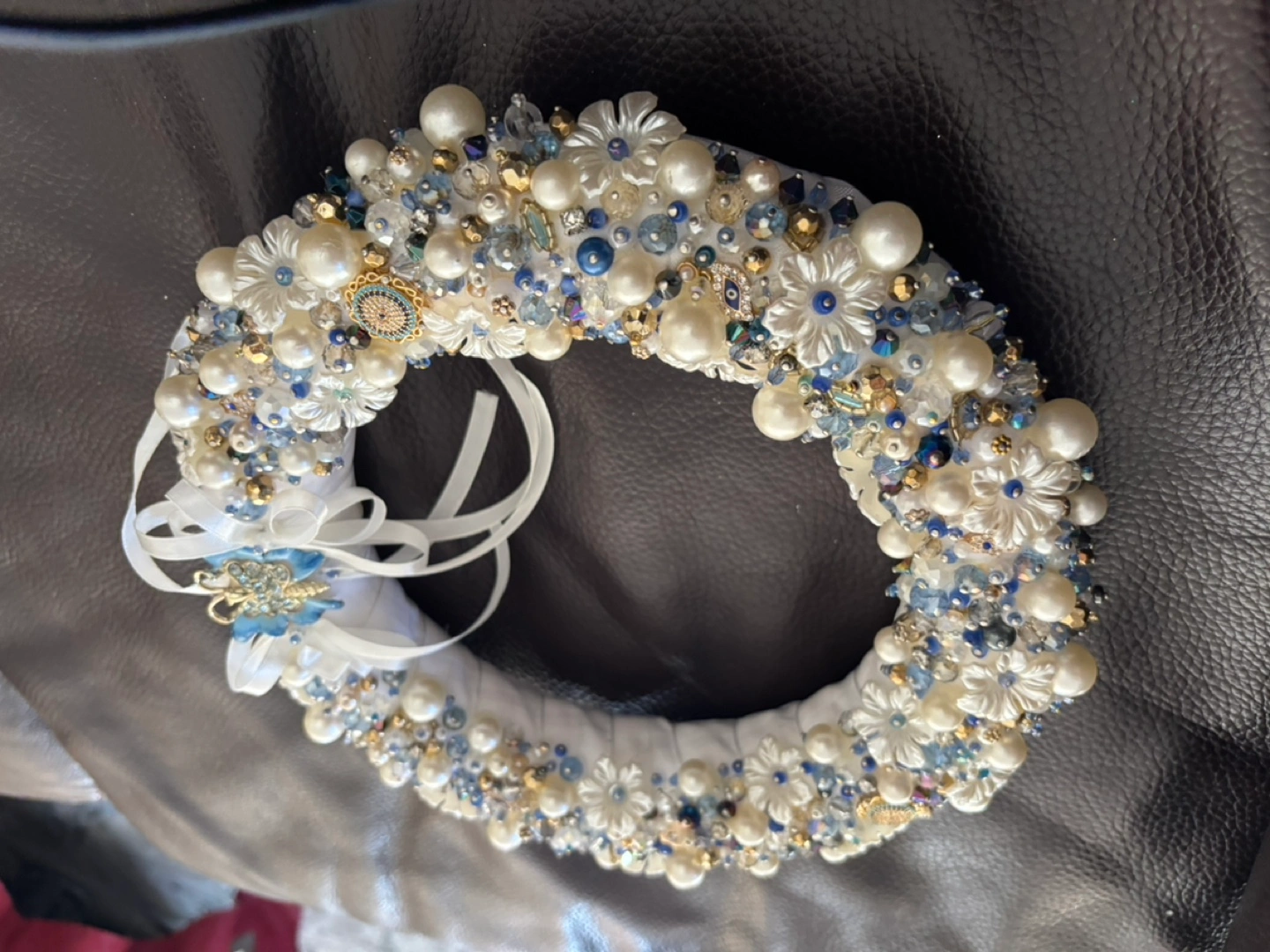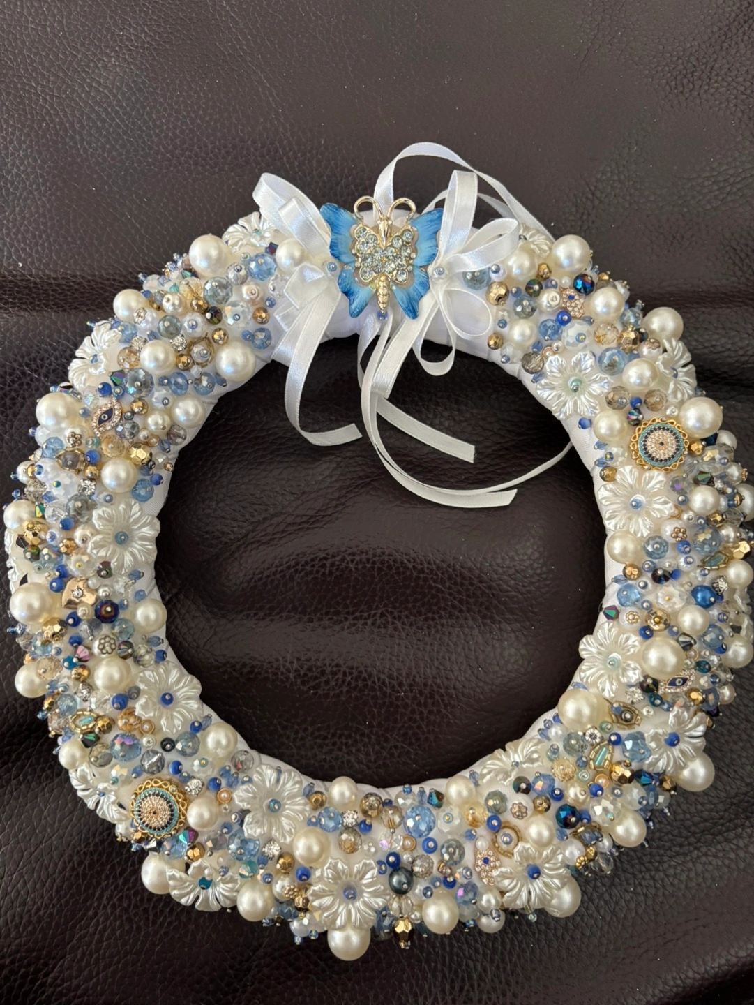White, blue, and gold beaded wreath with a blue butterfly accent and ribbon. Unique and elegant wreath for door or wall hanging decor. Can be used all year round or Christmas decorations or gift. Pickup in Mississauga, no hold, price firm