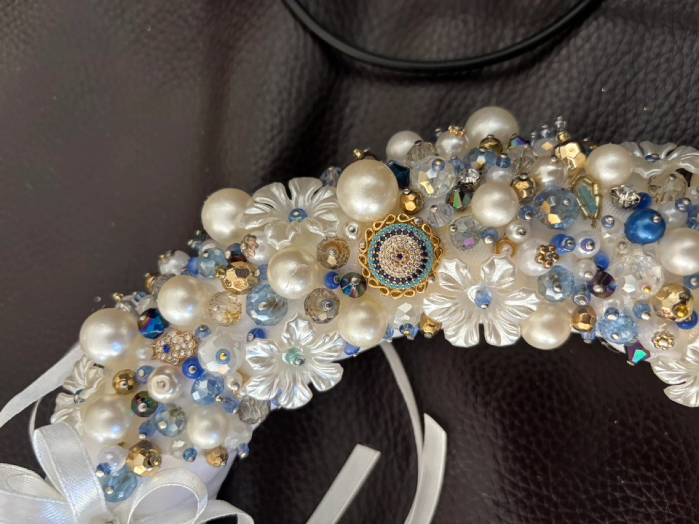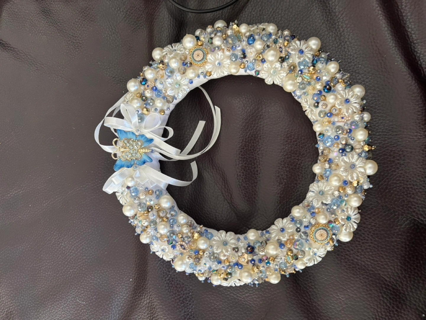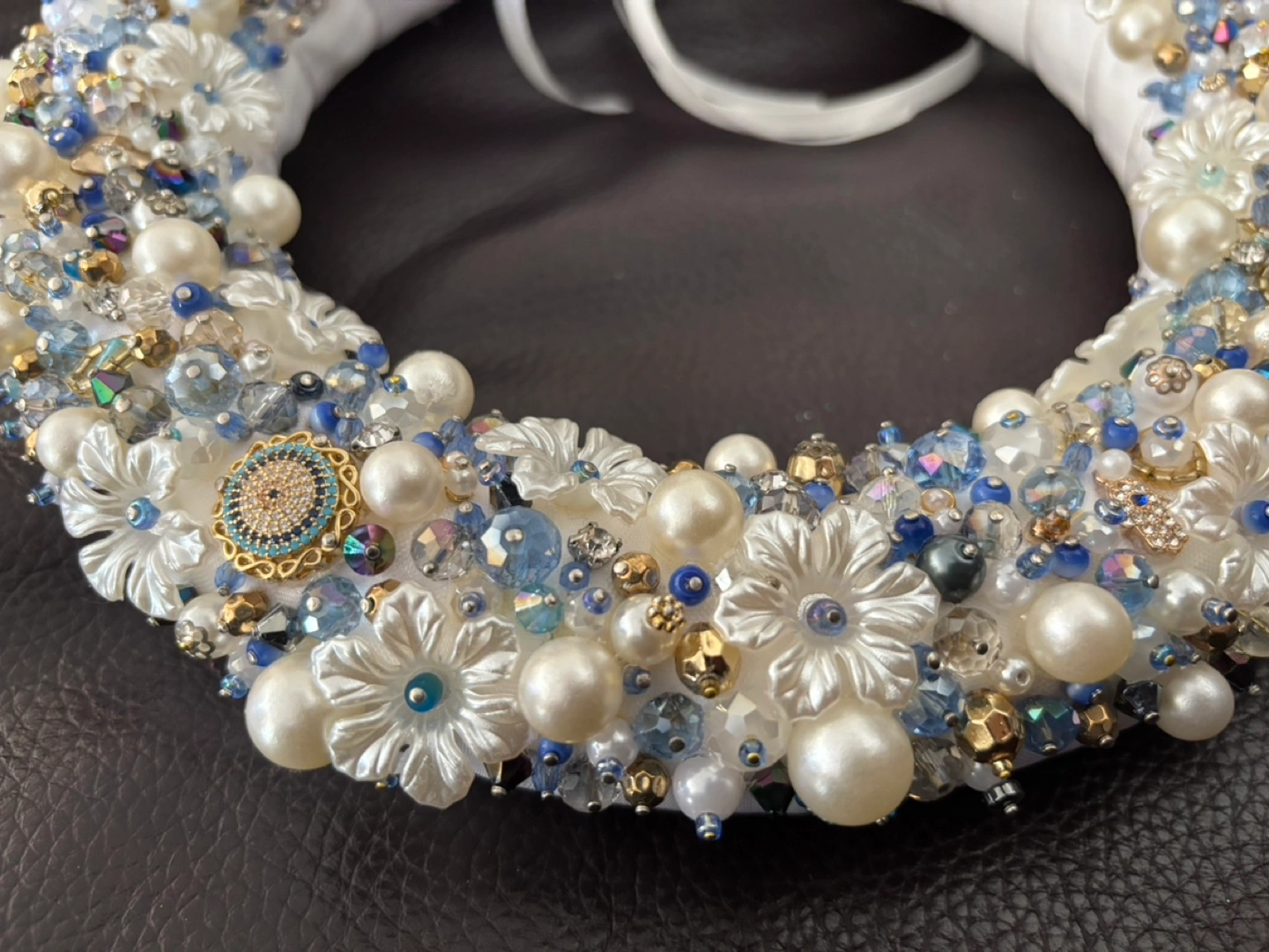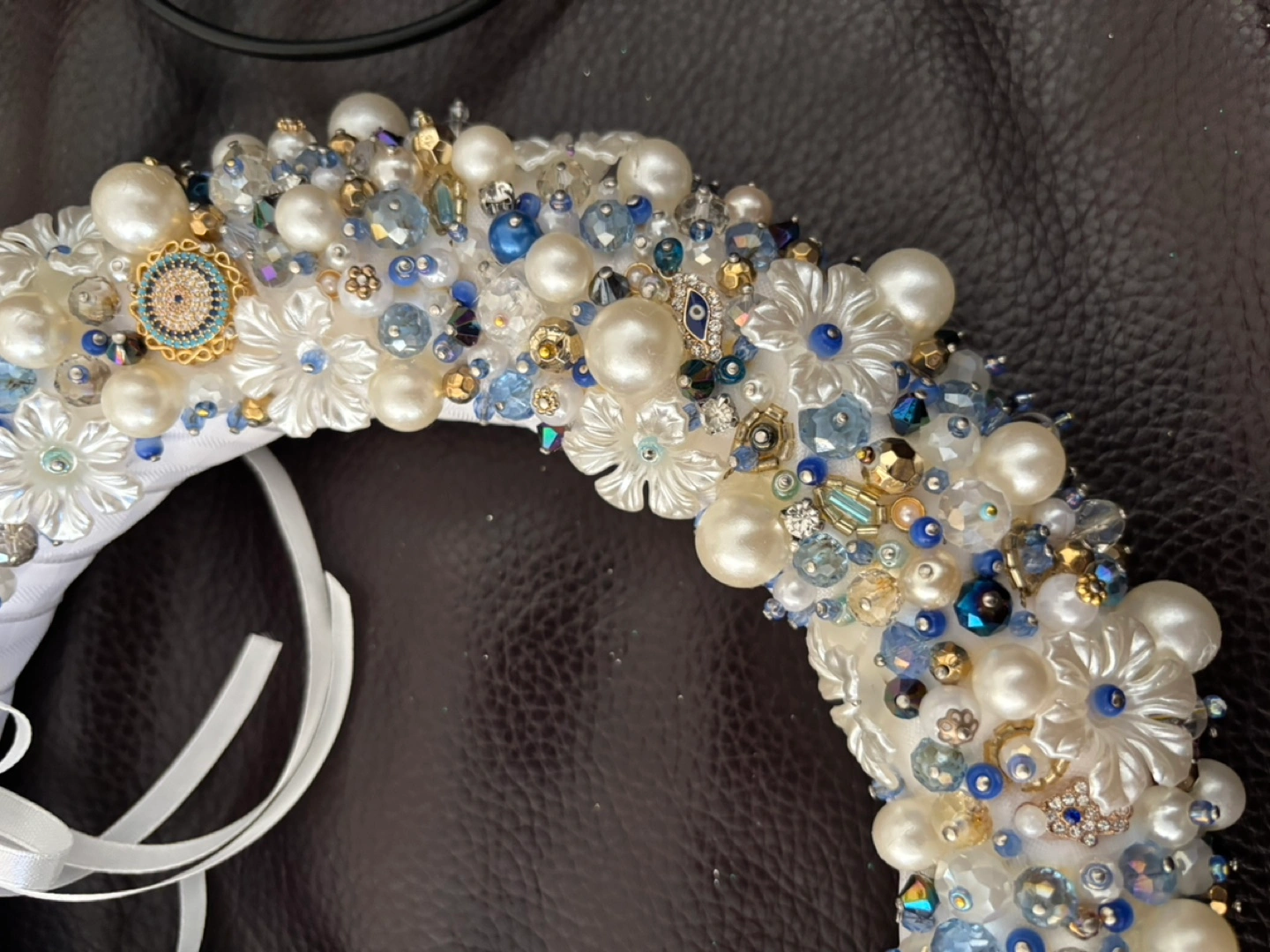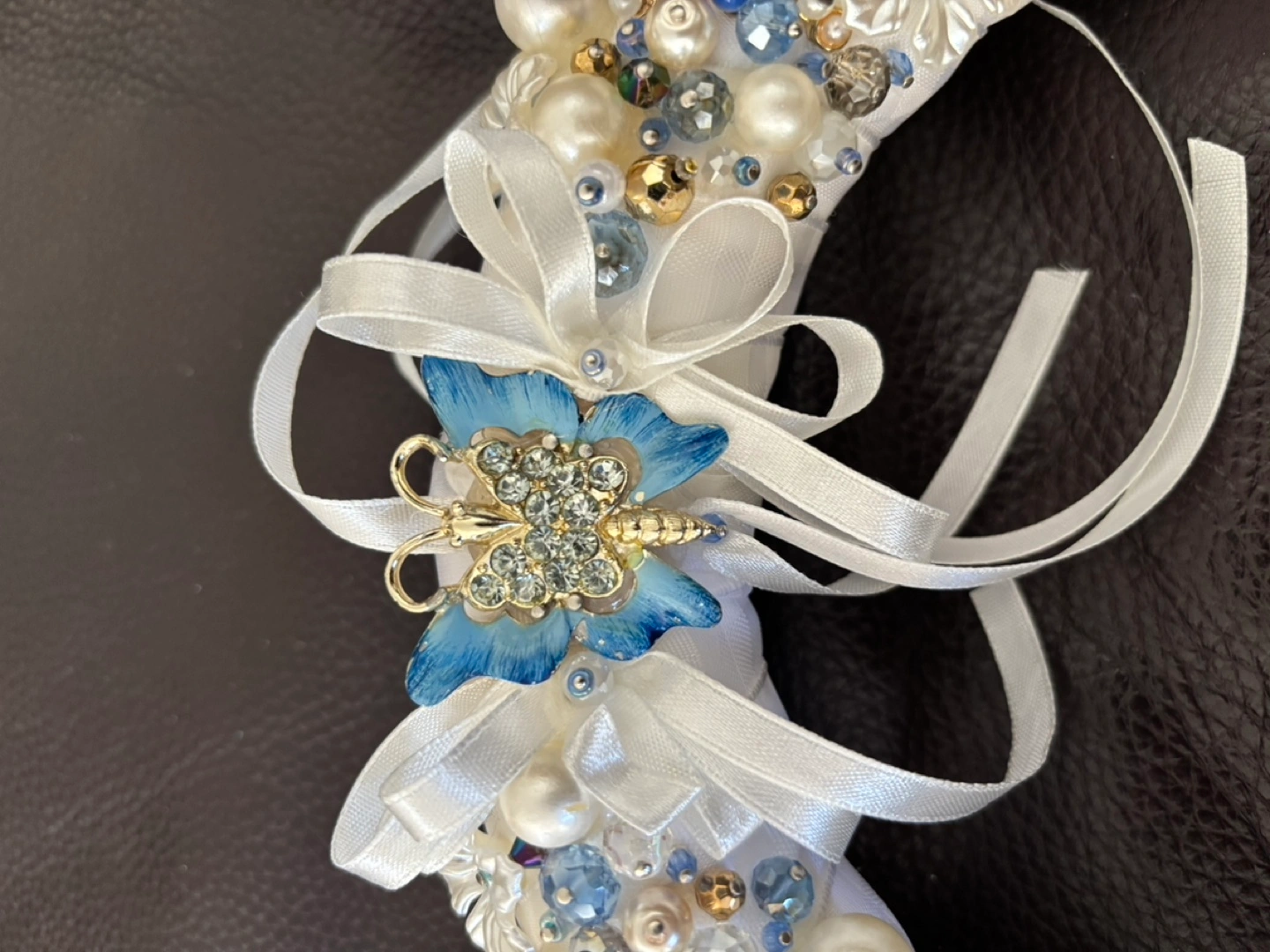 White, blue, and gold beaded wreath with a blue butterfly accent and ribbon. Unique and elegant wreath for door or wall hanging decor. Can be used all year round or Christmas decorations or gift. Pickup in Mississauga, no hold, price firm