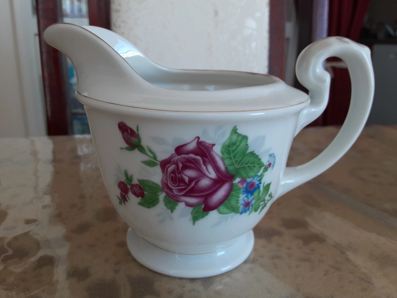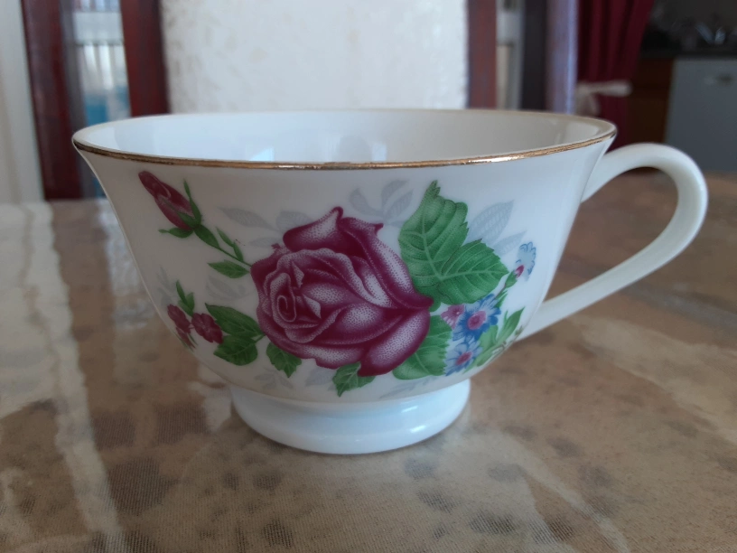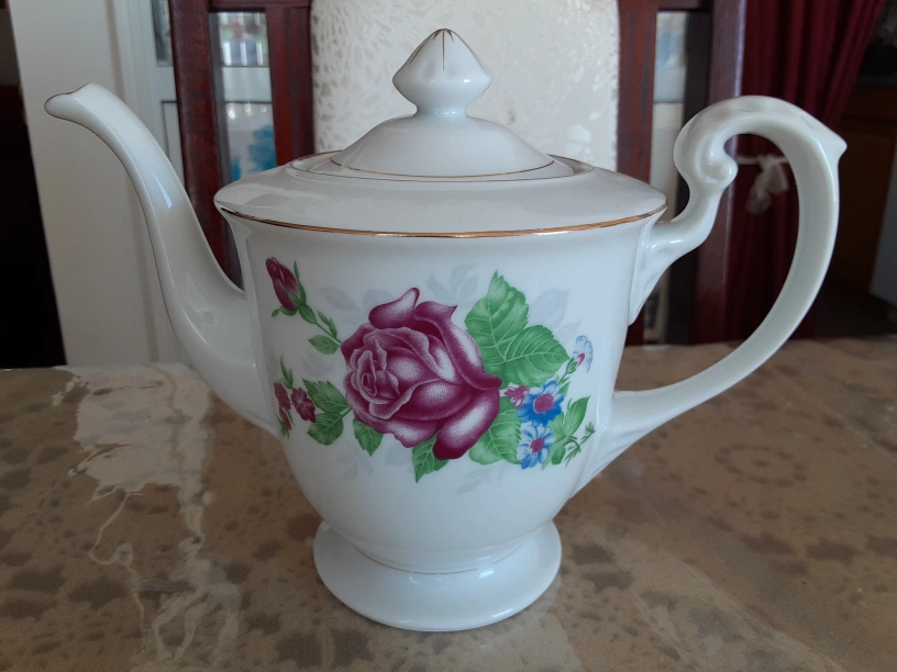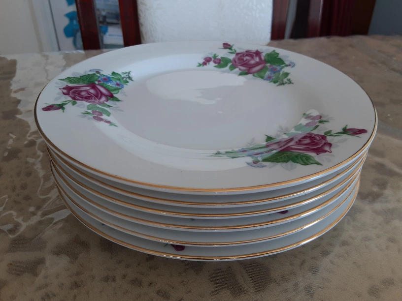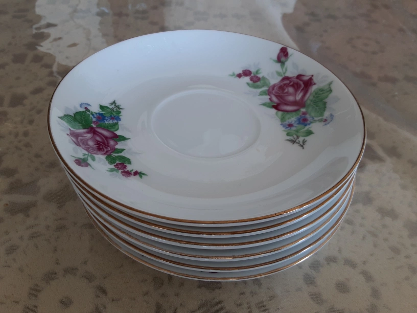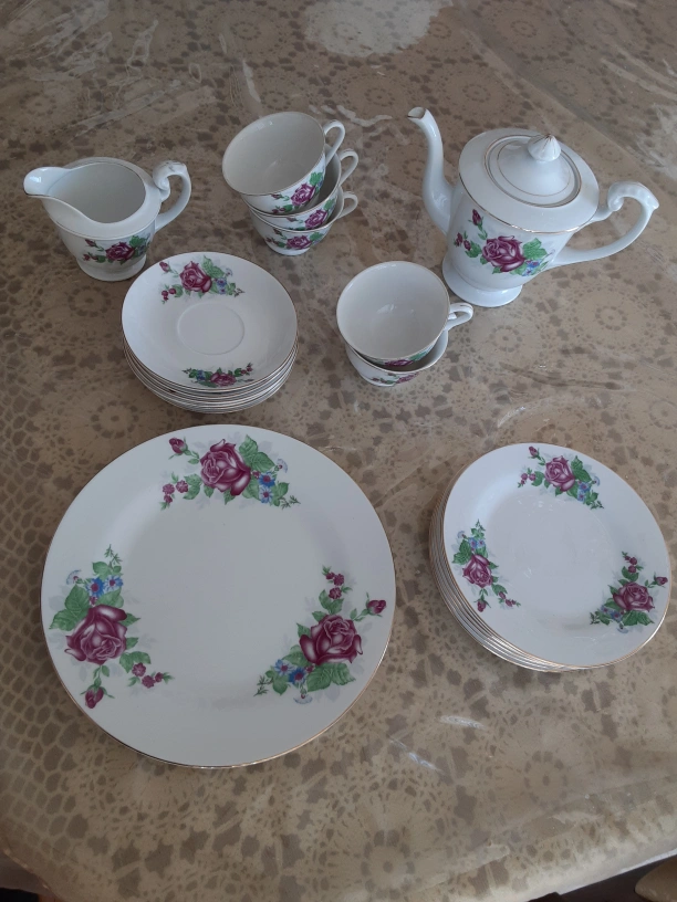 Tea set with a rose pattern, includes teapot, creamer, five cups and saucers, one dinner plate and six side plates. Gold trim around the edges.