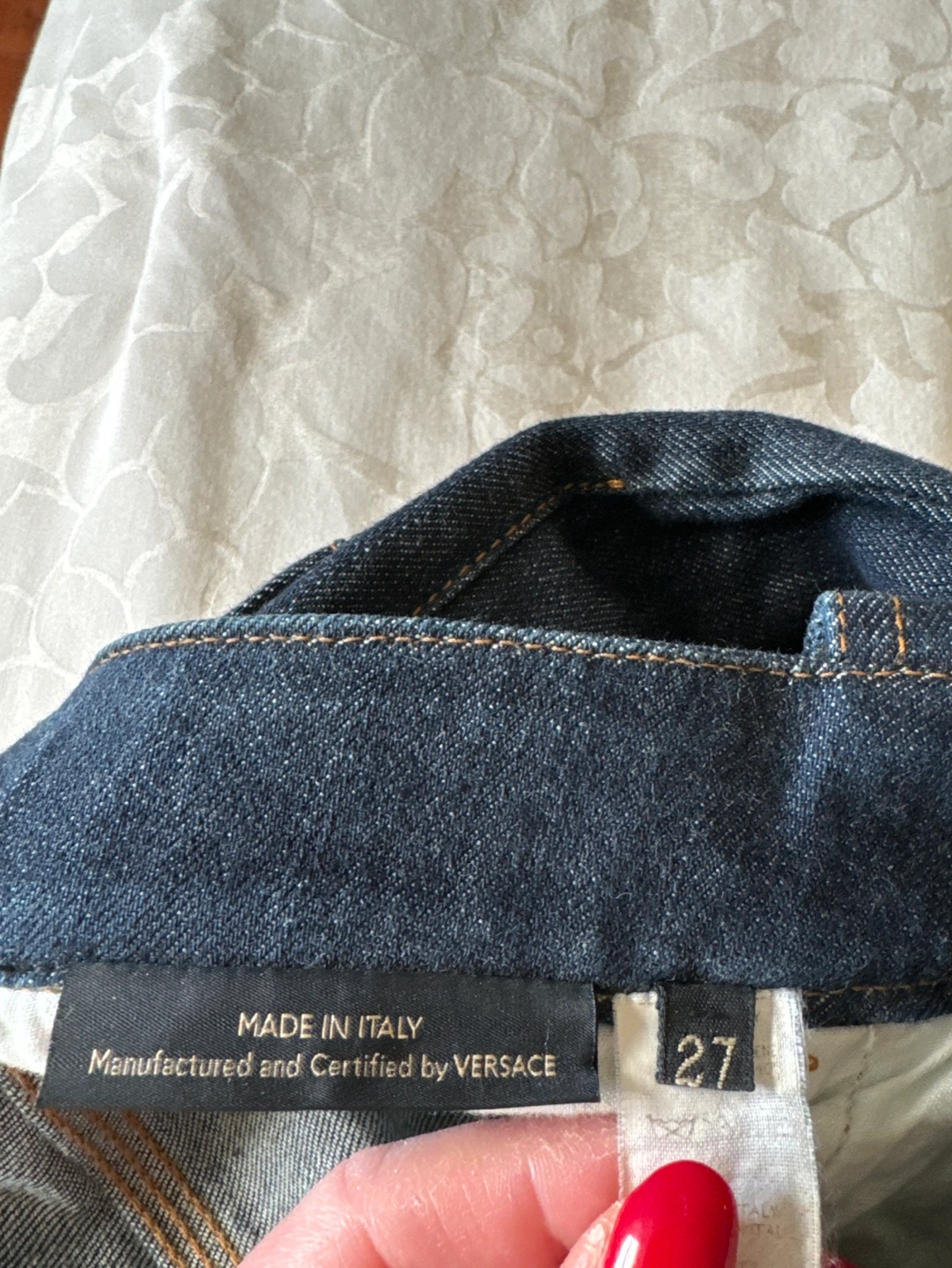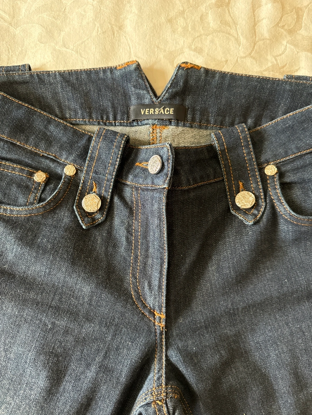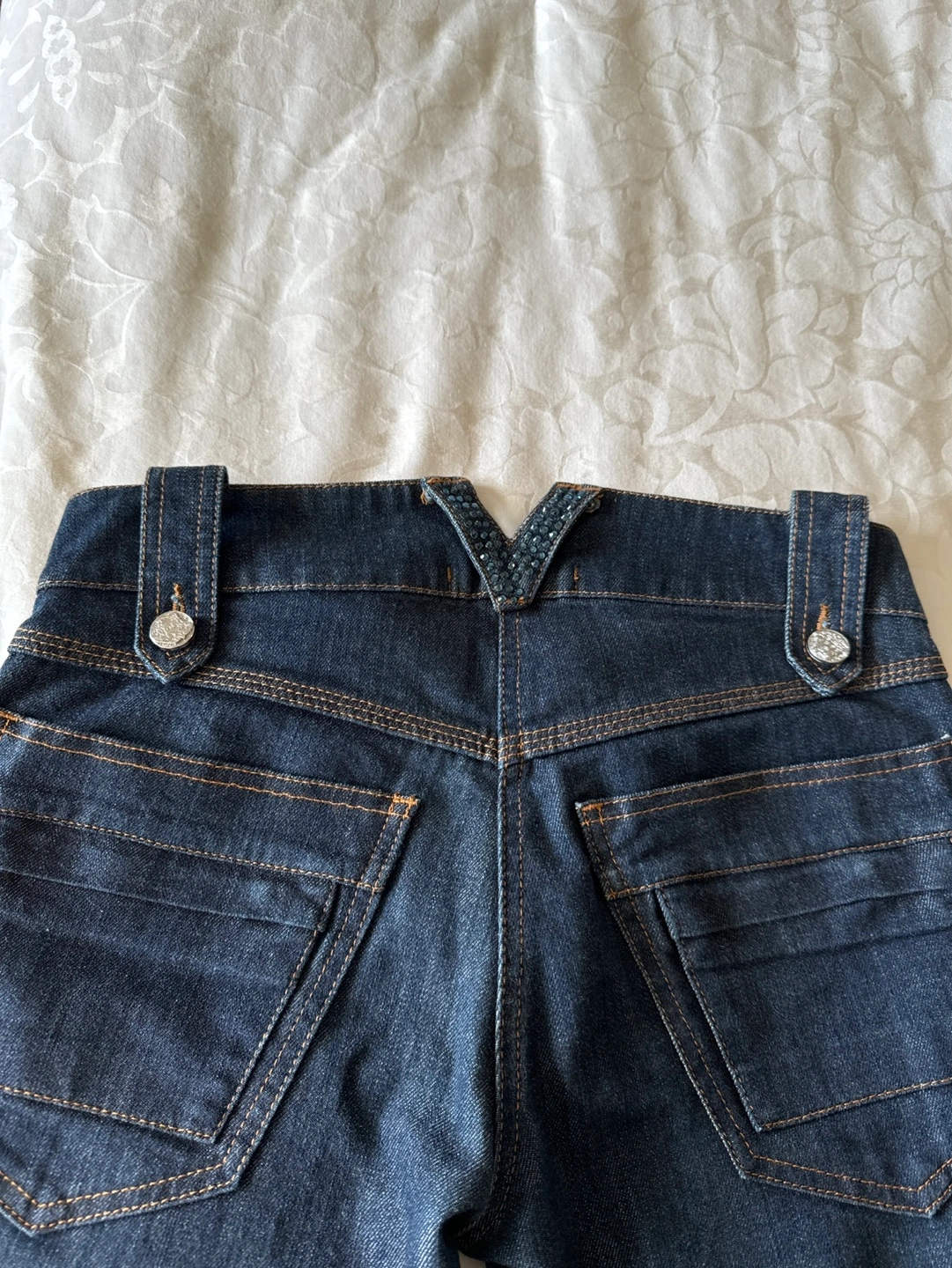 Dark wash denim jeans. Rhinestone embellishment on the back