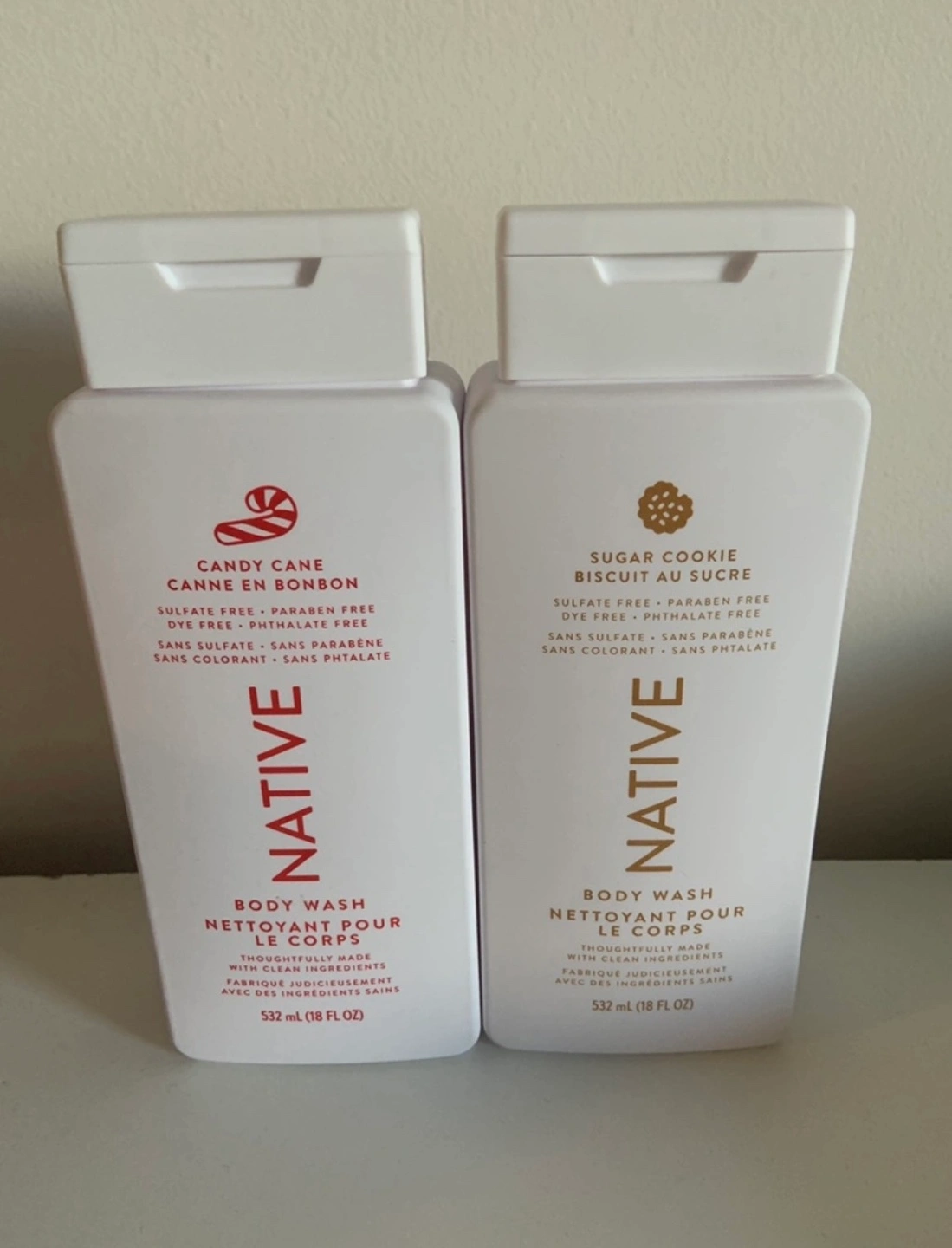 Two bottles of Native body wash. Candy Cane and Sugar Cookie scents. 532mL each. $6 each or $10 for both
