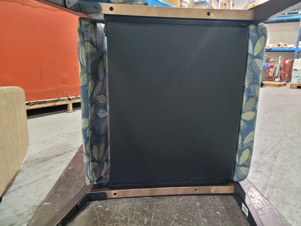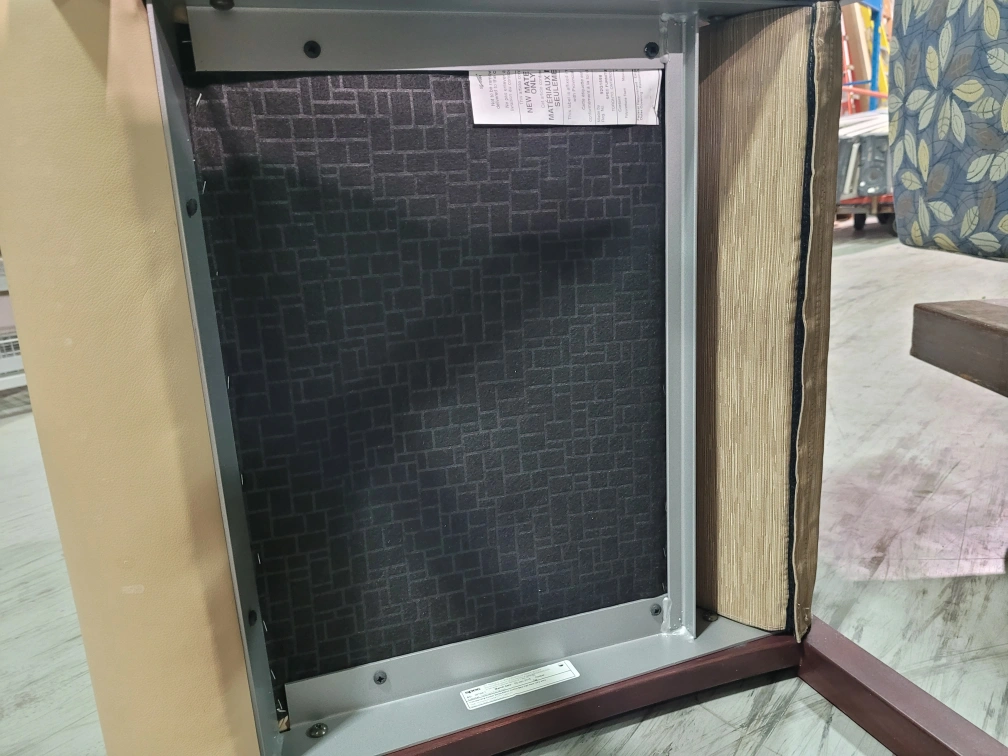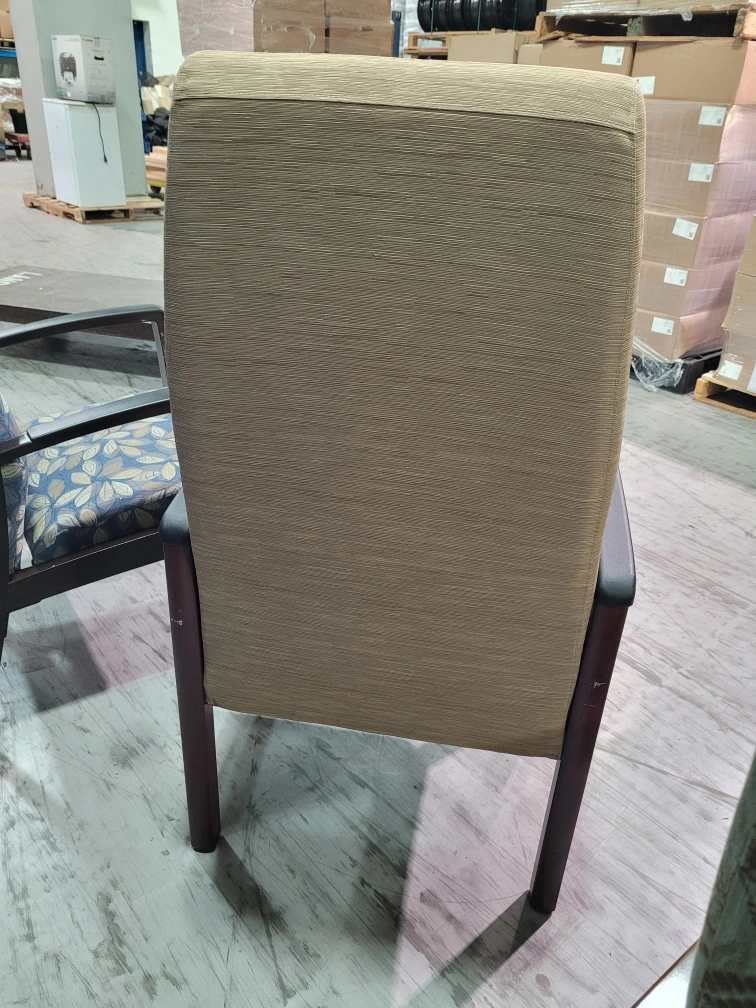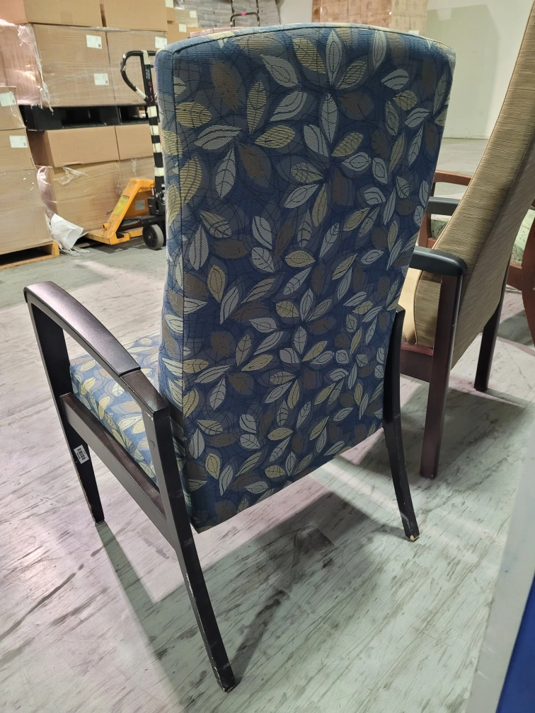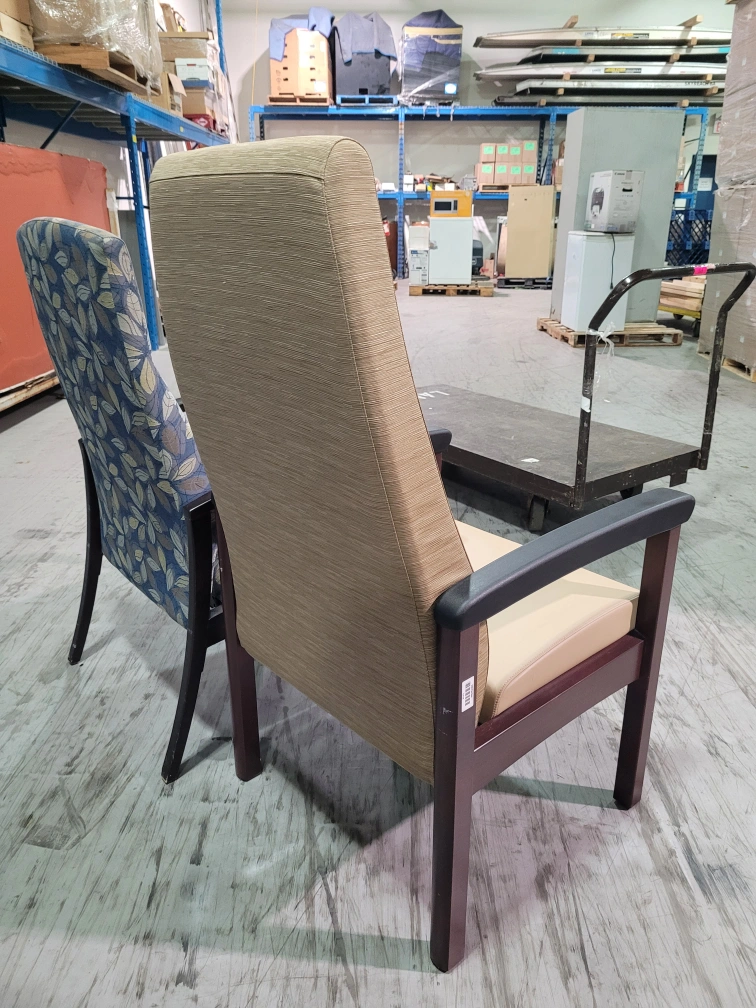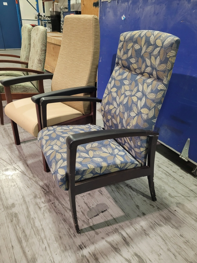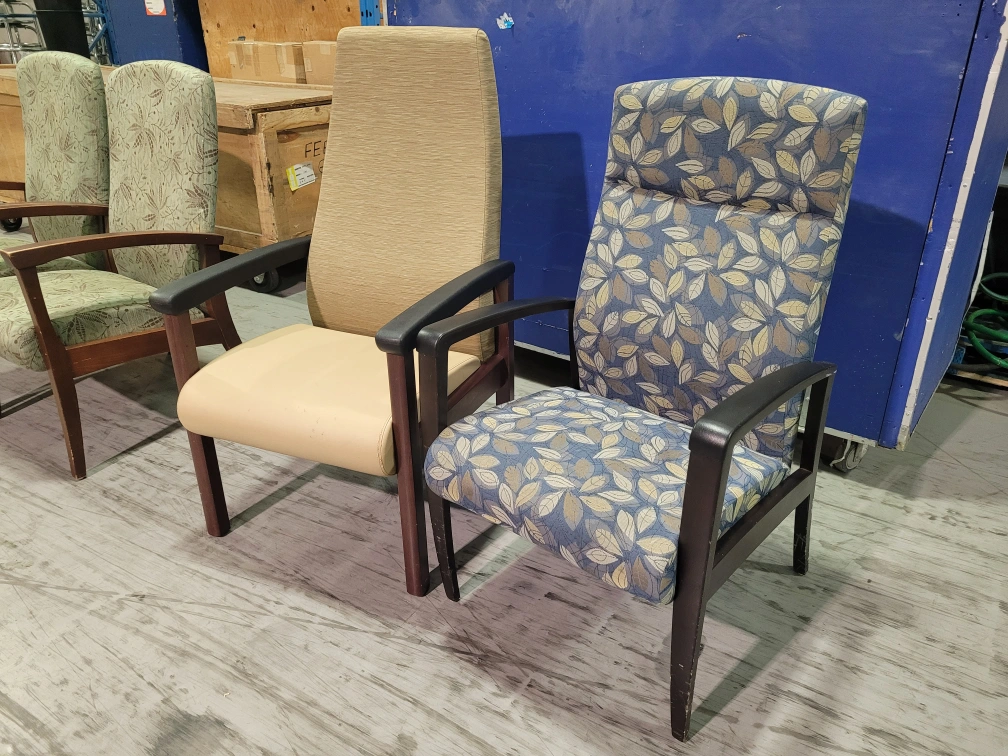 specially designed for support. 2 mis matched armchairs in good condition, with a dark wood frame and black armrests. One has a solid tan fabric and the other has a blue and brown leaf pattern fabric. Must pickup. Please. no etransfer or long holds. this is a cash price. bring cash. This is in storage and I will meet you there. I can access the building during 8 to 430 Monday to Friday. No one is there outside of those times.
