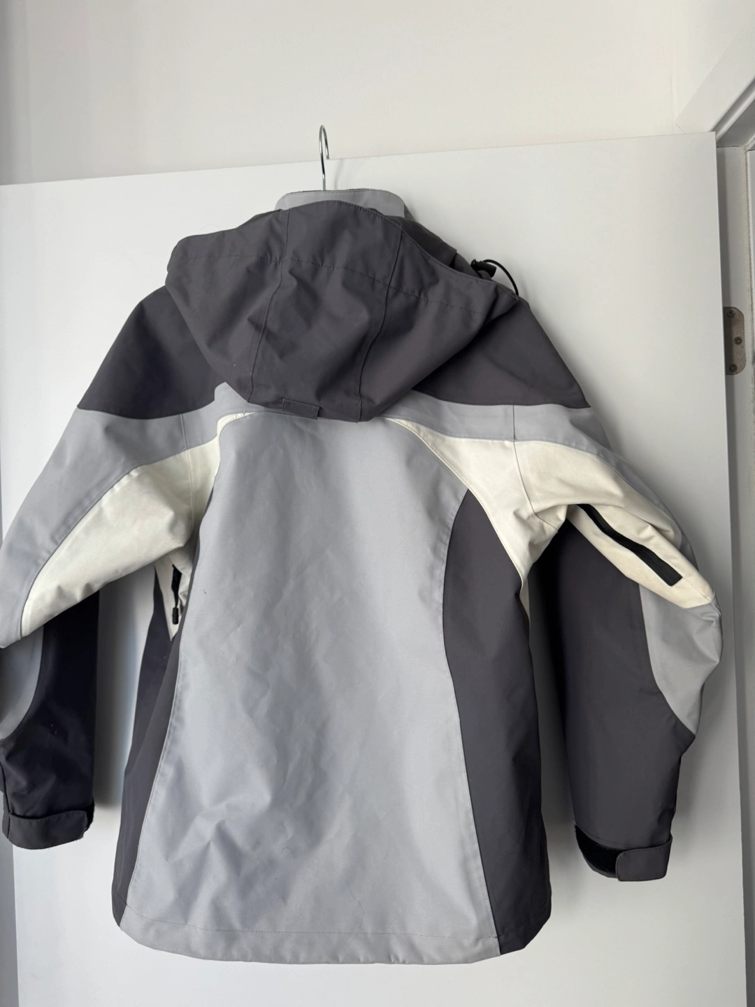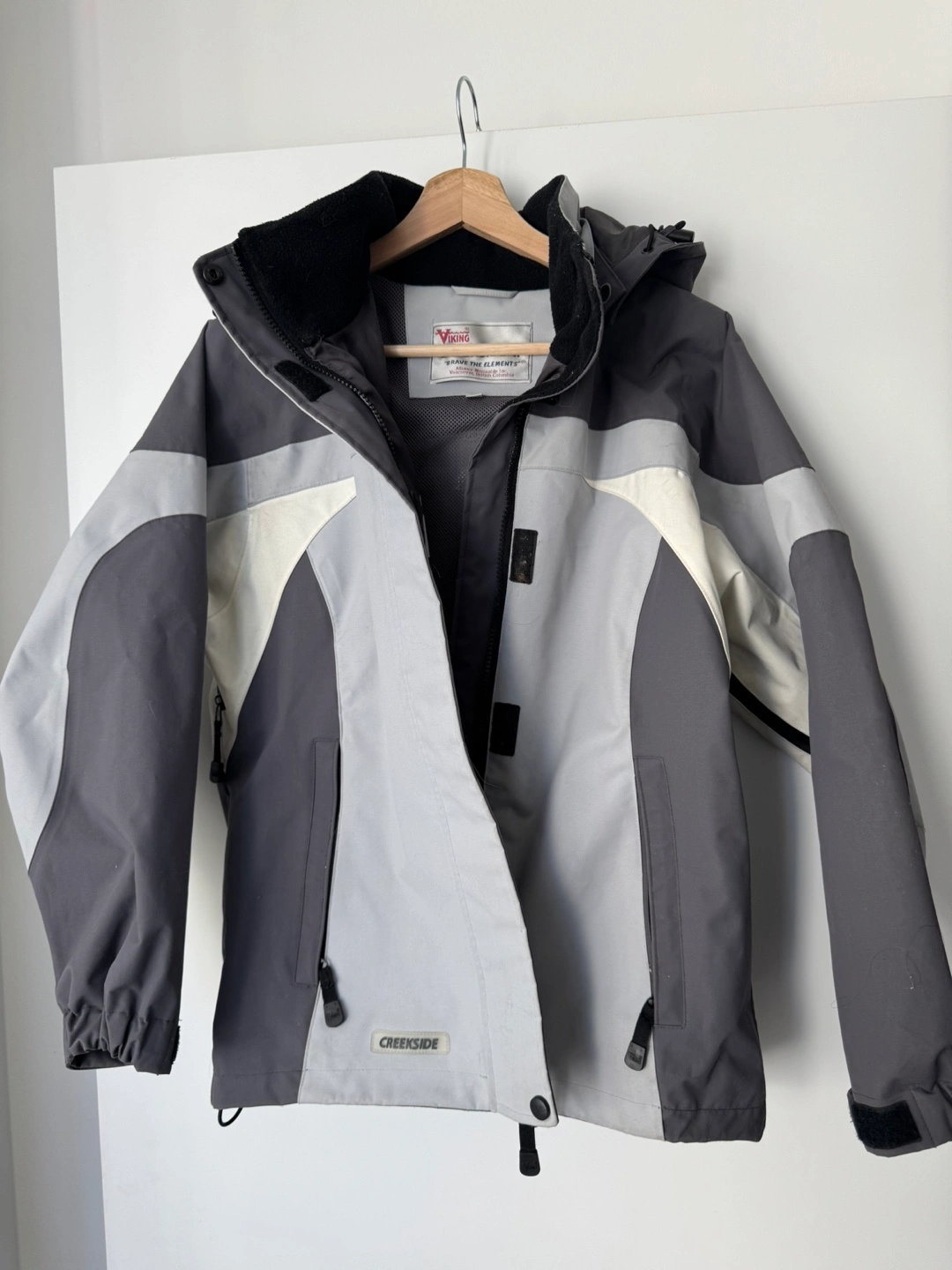 Grey and white Viking Women's Creekside Reflective Piping Rain Jacket with Detachable Hood Has a zipper and snap closure.