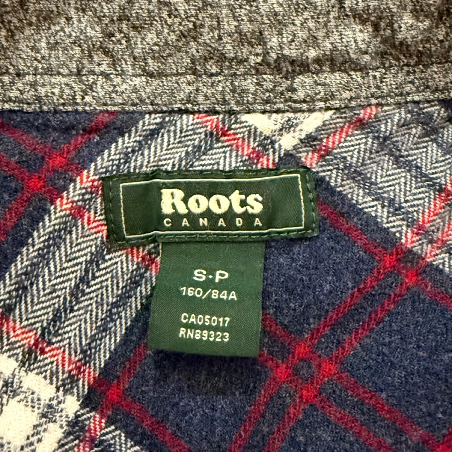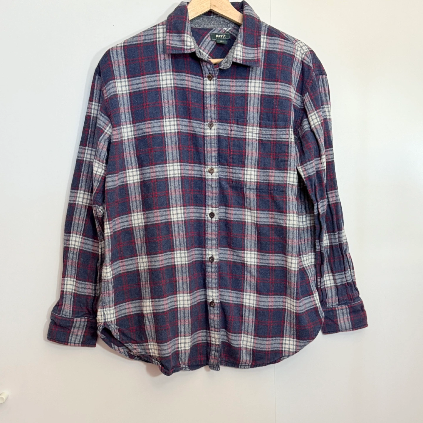 Long sleeve button up flannel shirt with a chest pocket. Blue, red, and white plaid pattern.