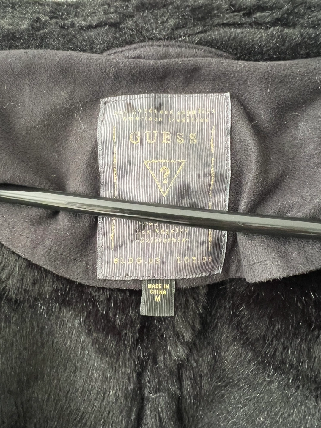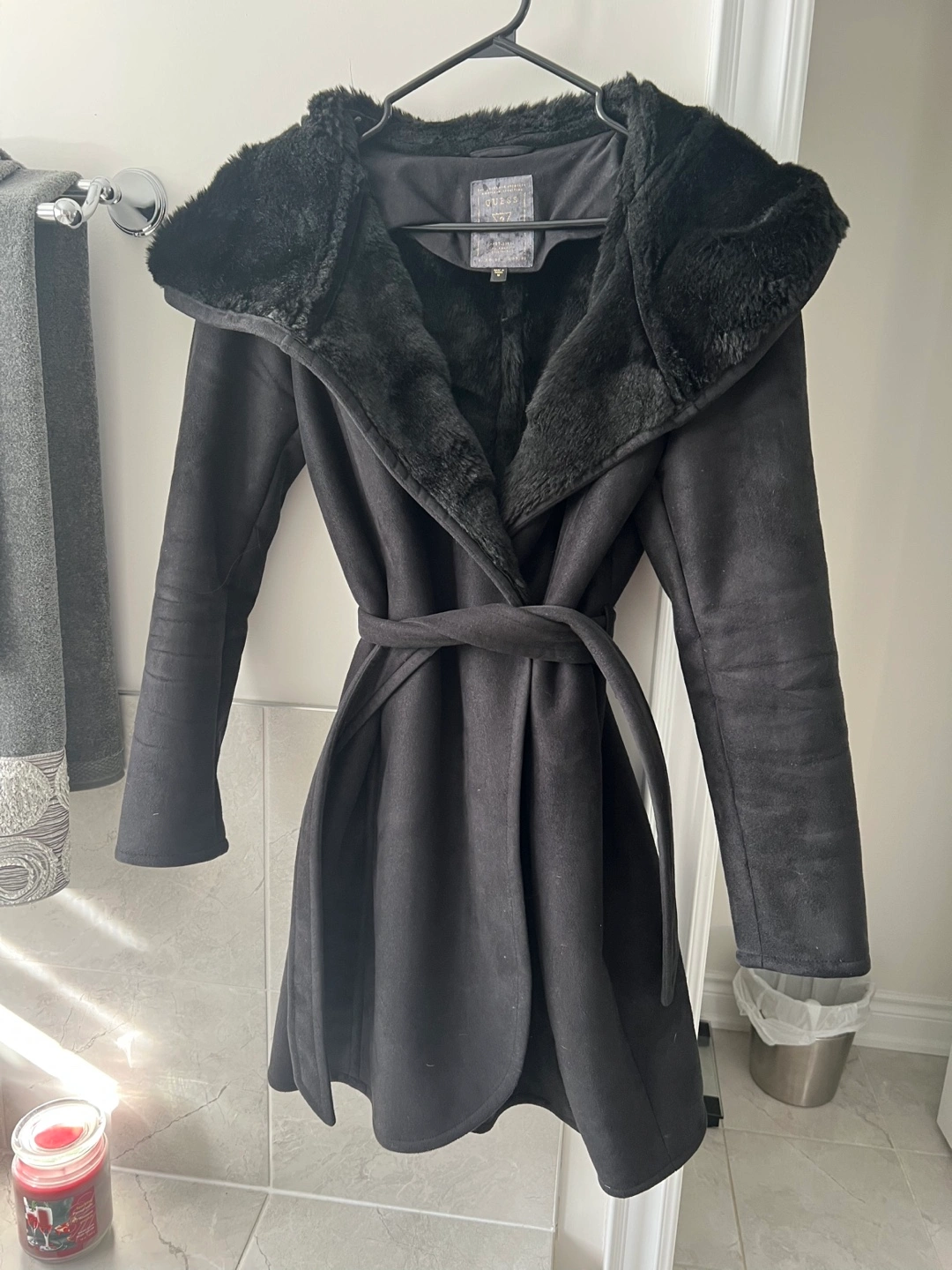 Guess black coat with faux fur trim. Belted waist. Long sleeves. Hood. In great condition and so stylist. Make an offer