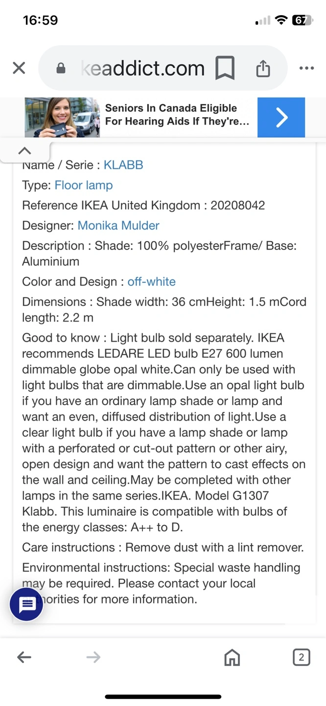 Please read all. ———— •Store/Model: Ikea/Klabb. Discontinued and replaced by Uppvind, see last pic for comparison. •Colour: (?) Looks like a dark brushed nickel. See pics and come to look at it if you want. •Condition: Like new •Measurements base: 6.25”x9” For the hight, see pic (around 5F). •Retail/Value/Paid: $150 tax in. •Note that lightbulb and shade are Not included. ————— Pick-up and cash only. Location Map on listing. Thx! 💛Pls, look at my other listings for great bundle discounts.
