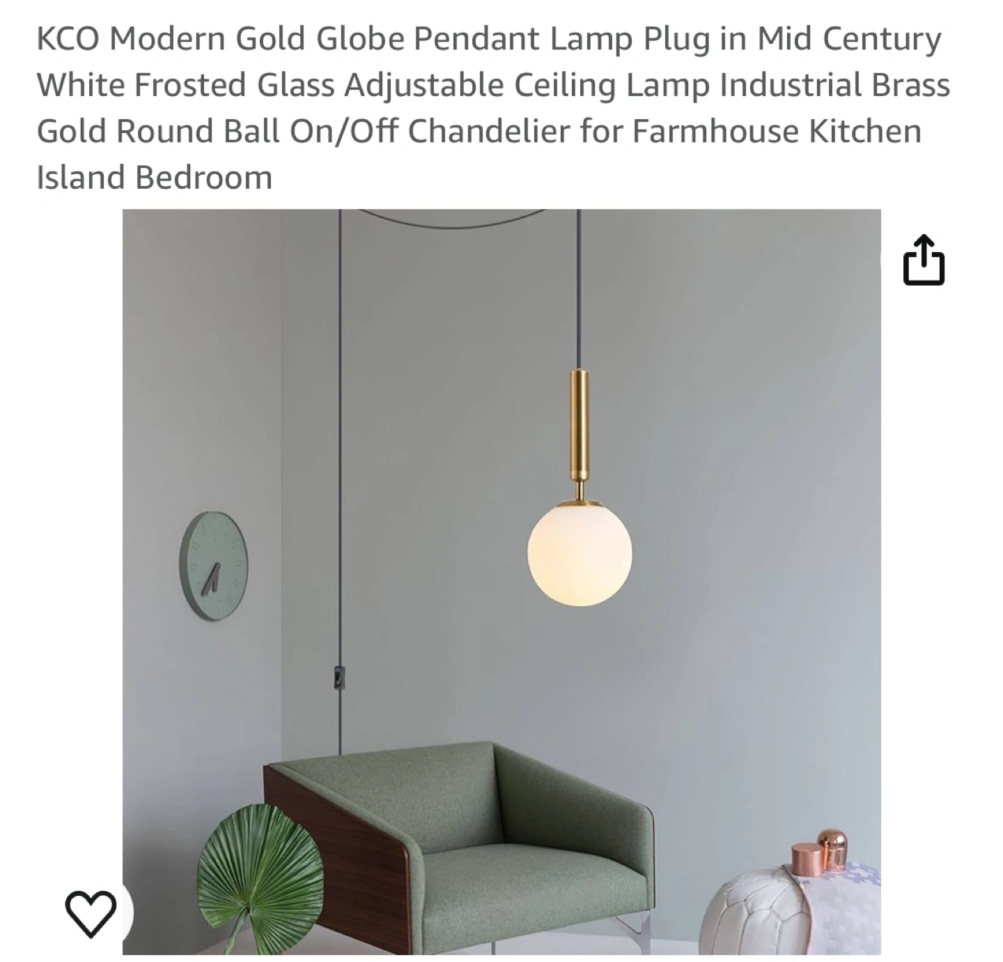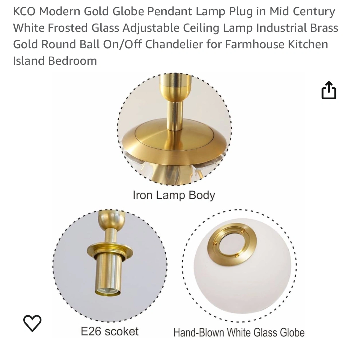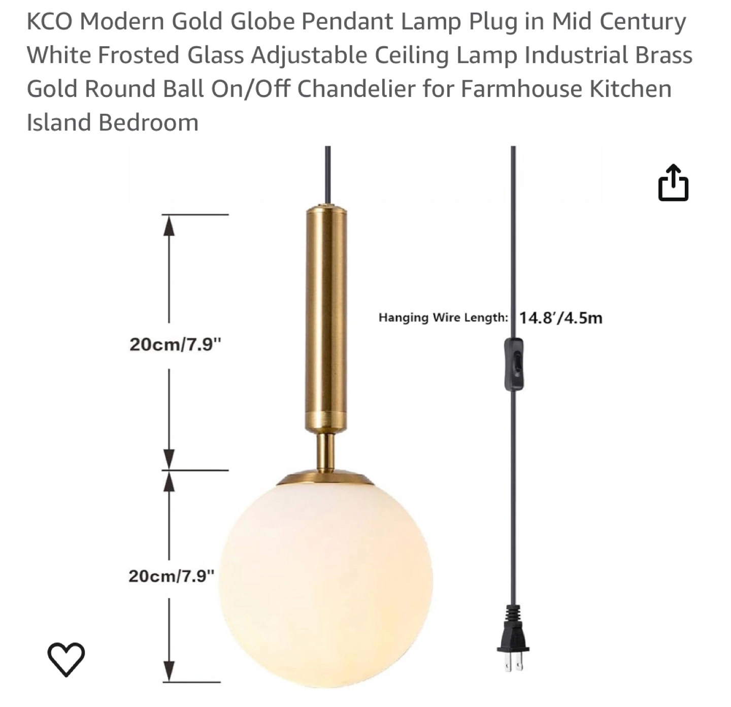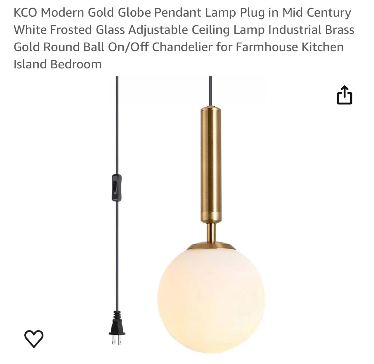 Frosted glass globe pendant lamp. Gold finish. Adjustable length cord with on/off switch.