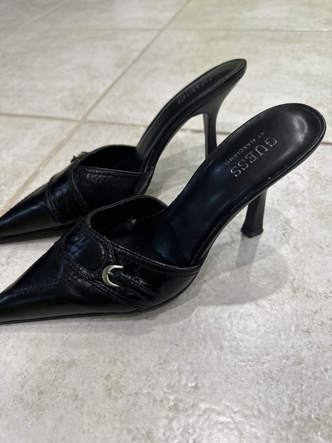 Black leather heeled mules. Pointed toe. Buckle detail.