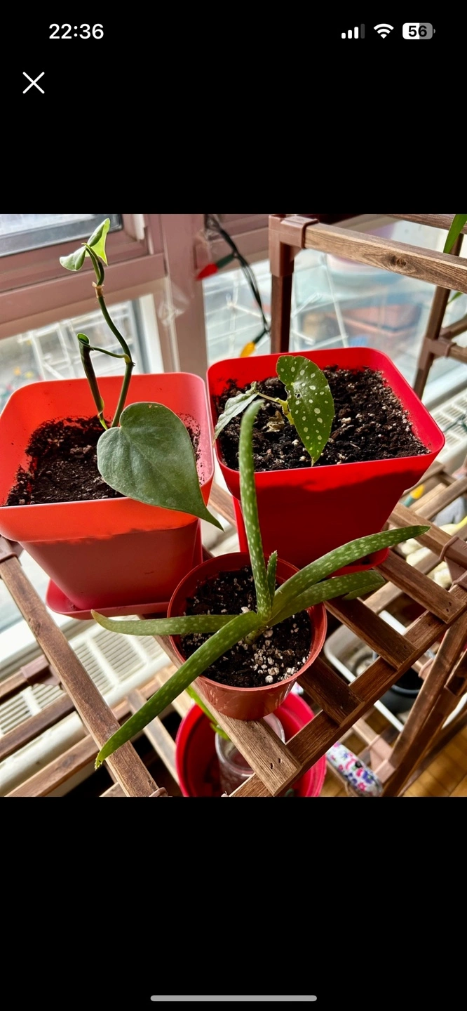Three baby potted plants, one in a red pot, one in a terracotta pot, and one in a pink pot. 6$ for all. They will grow bigger. Begonia maculata + Aloe + Heartleaf Philodendron.
