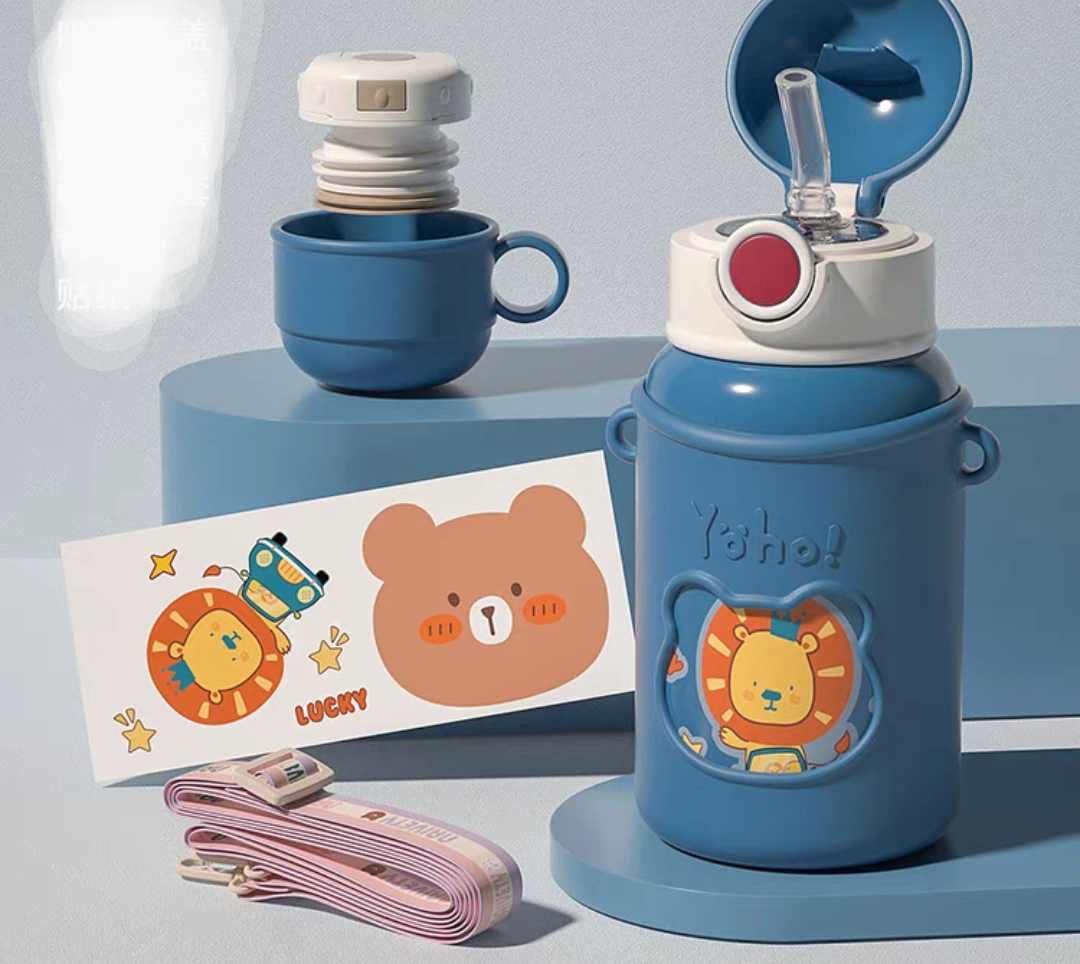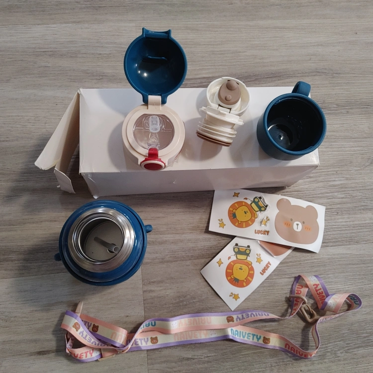 Blue steel insulated water bottle with straw, comes with two lids, a carrying strap, and stickers. It's for warm water below 40 degrees, as well as cold water brand new