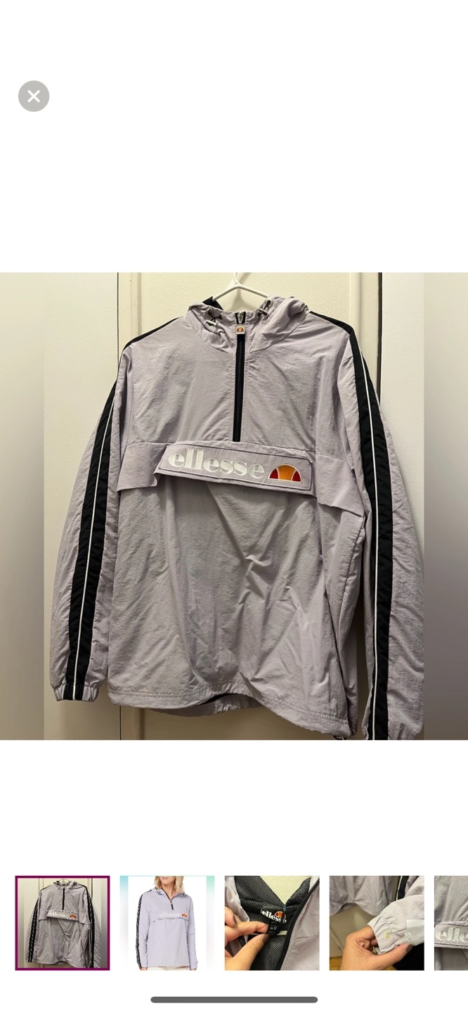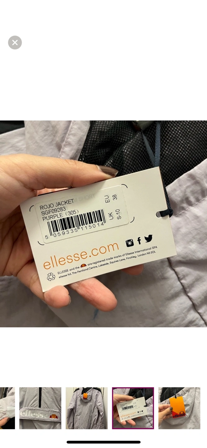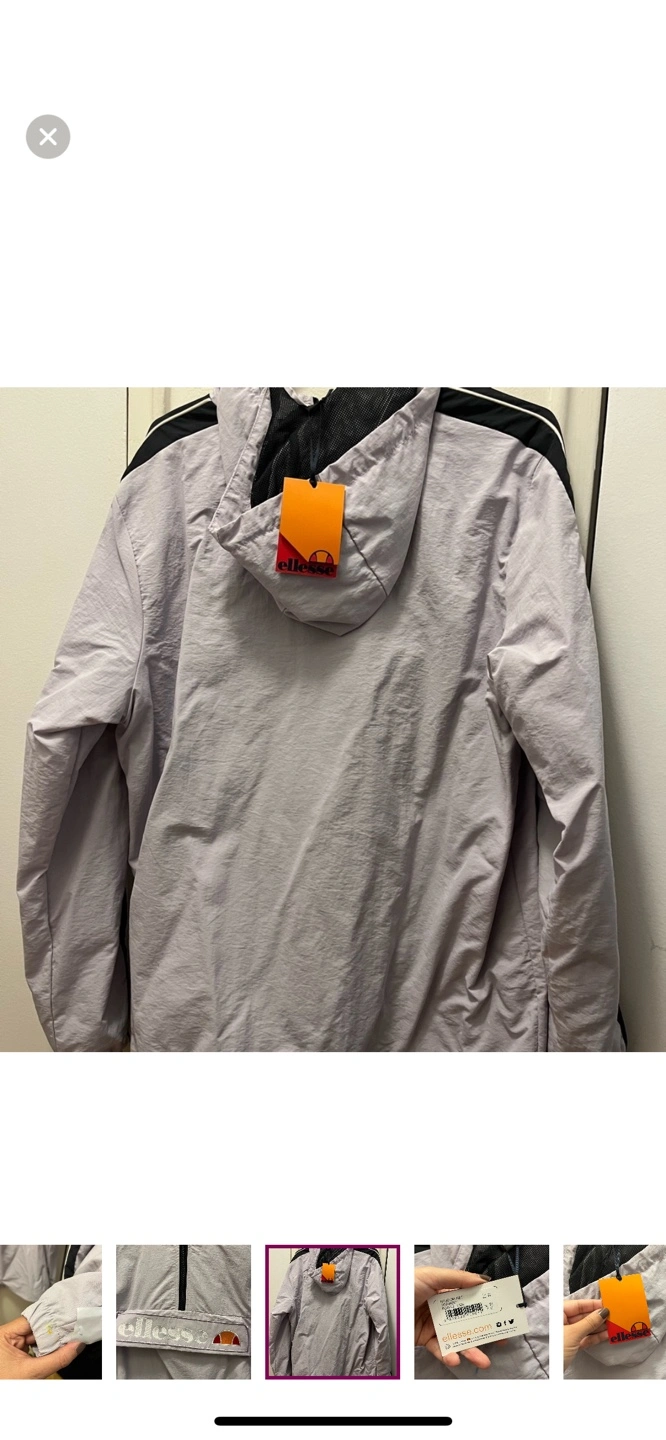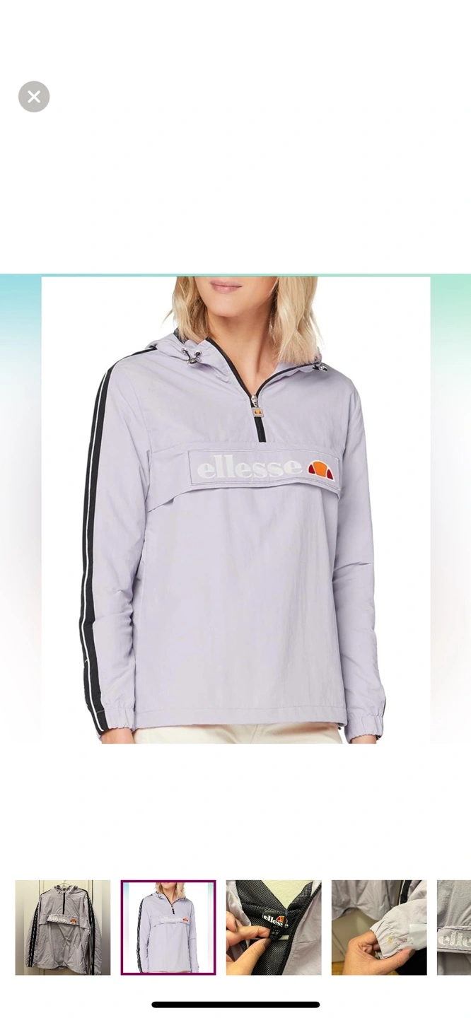 Purple light jacket with black accents. Size US 6. Has a hood and a zip closure. New with tags. Has a small orange mark on wrist area but very small