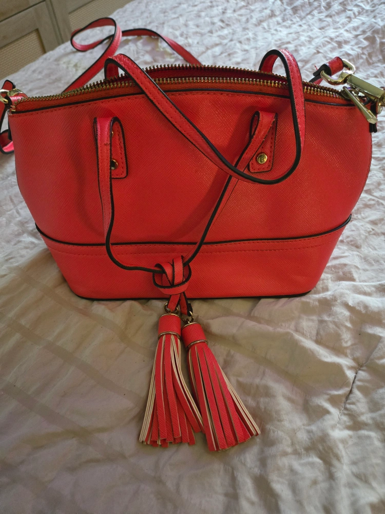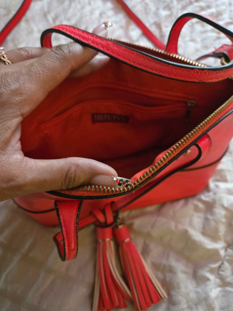 Small, bright orange purse with gold hardware and two tassels. Features a zipper closure and a small interior pocket. Can be worn as a crossbody bag or a shoulder bag.