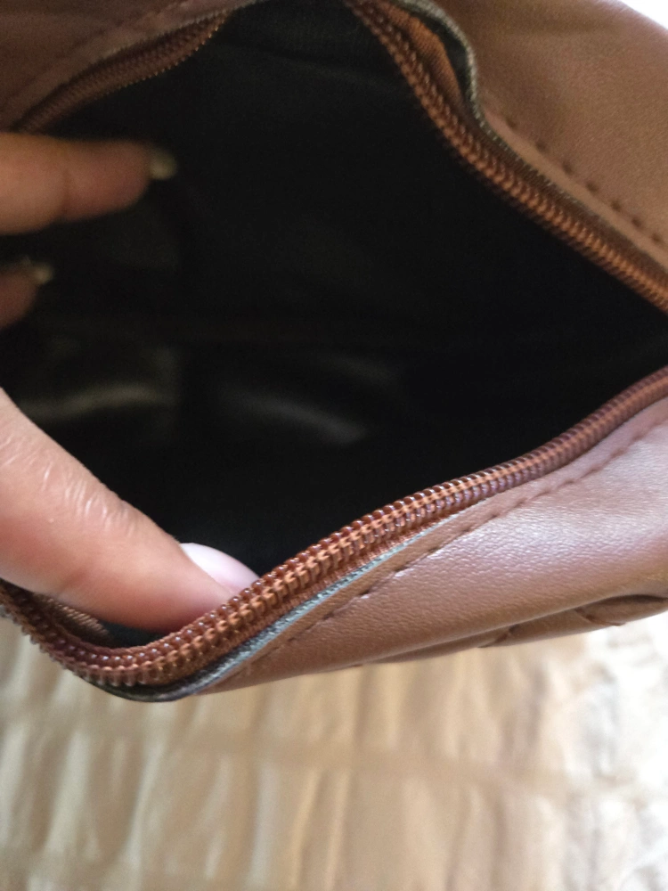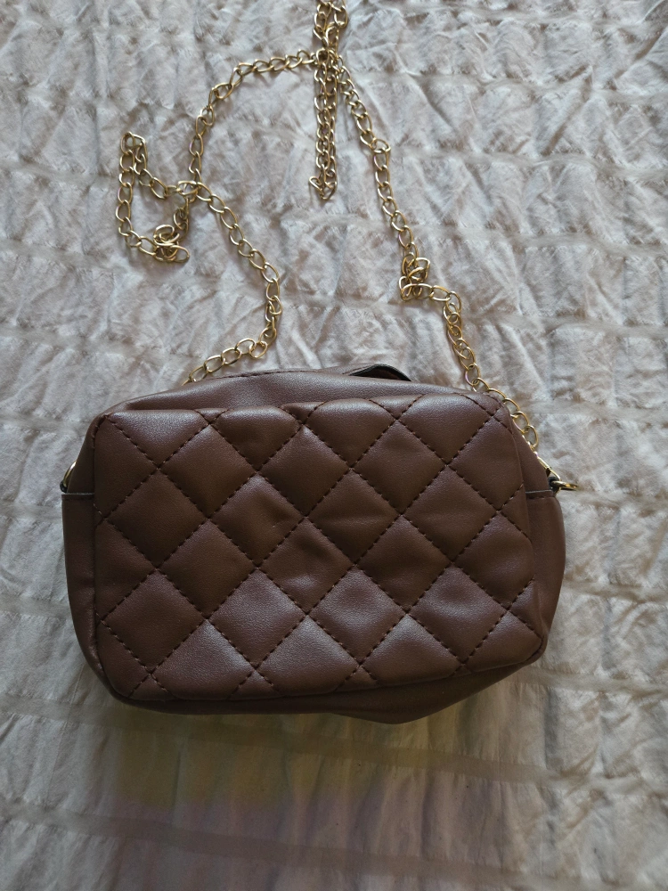 Small brown quilted chain bag. Zipper closure. Gold chain strap. Perfect for a night out or everyday wear.