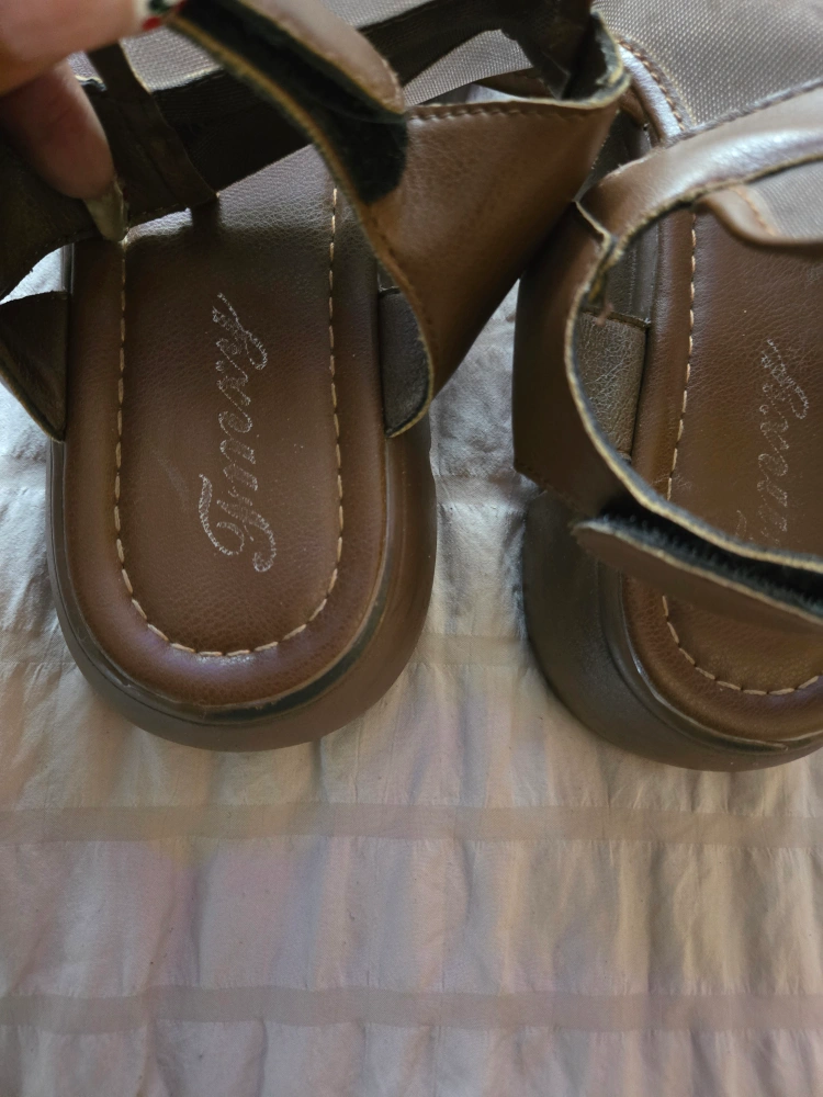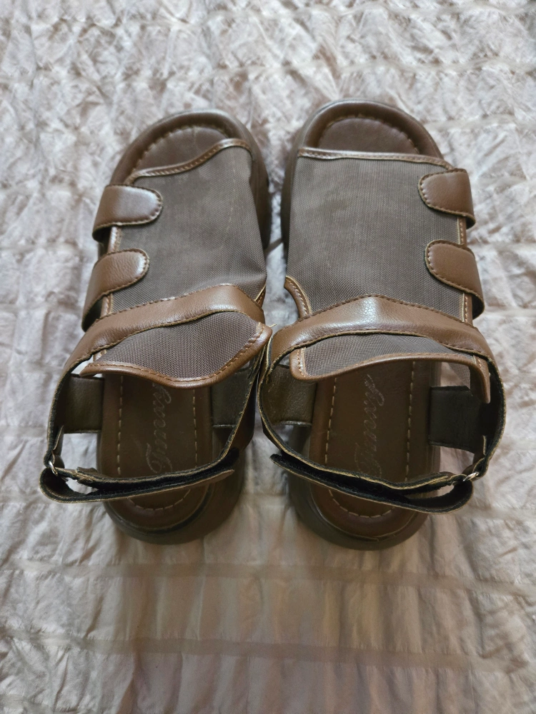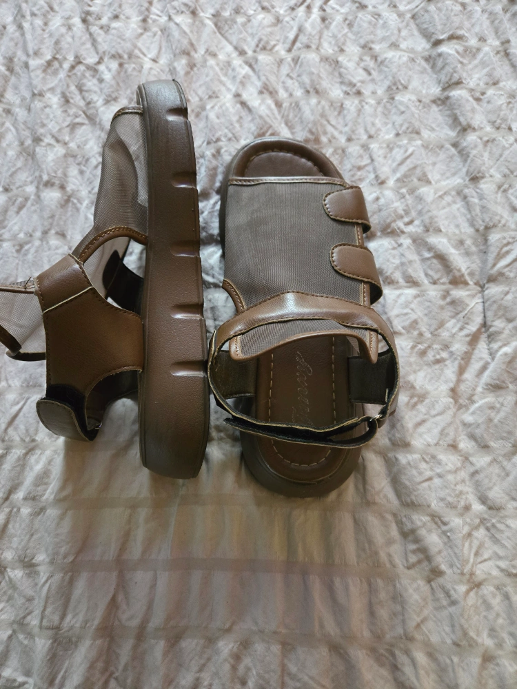 Brown leather sandals with a mesh upper. Buckle closure. Nice, thick, cushion, sole. Great for people with back, hip or heel issues