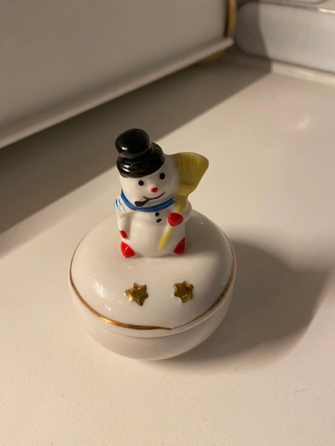 Small trinket box with a snowman lid. White porcelain with gold accents.