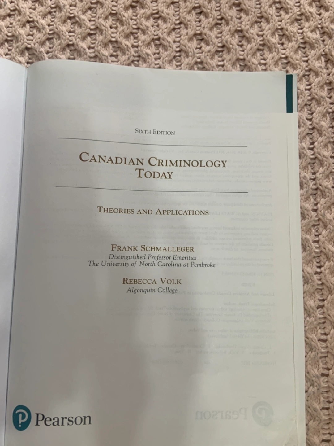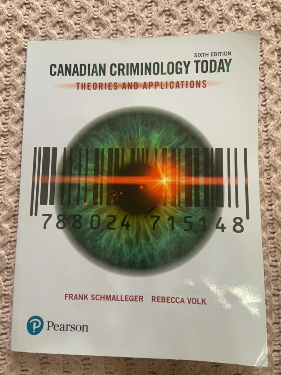 Canadian Criminology Today, Sixth Edition by Frank Schmalleger and Rebecca Volk. Textbook includes theories and applications.