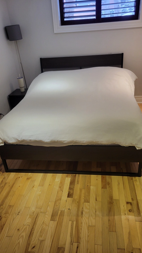 Queen-sized bed frame with headboard and slatted base. Black frame with brown woodgrain effect on headboard. Includes storage space under the bed. Leroy slats - 1 slat has a crack and another is a bit loose. All others are in great condition. Pick up required and needs to fit in your own vehicle. Will already be disassembled when you pick up. All Measurements: Headboard height is 39" Clearance (for under bed storage) is 7 3/4" Width: 62 1/4 (fits 60 1/2" inside the frame) Length: 81 3/4" (it's 80" inside frame)