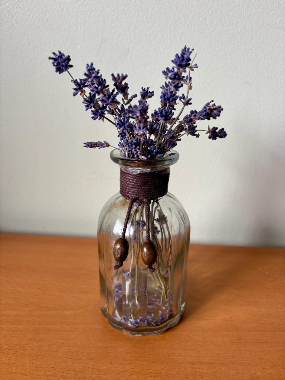 Glass vase with a brown cord around the neck and wooden beads, by the Pier Imports. Filled with dried lavender. Click on my name above to see my other listings and pickup locations.