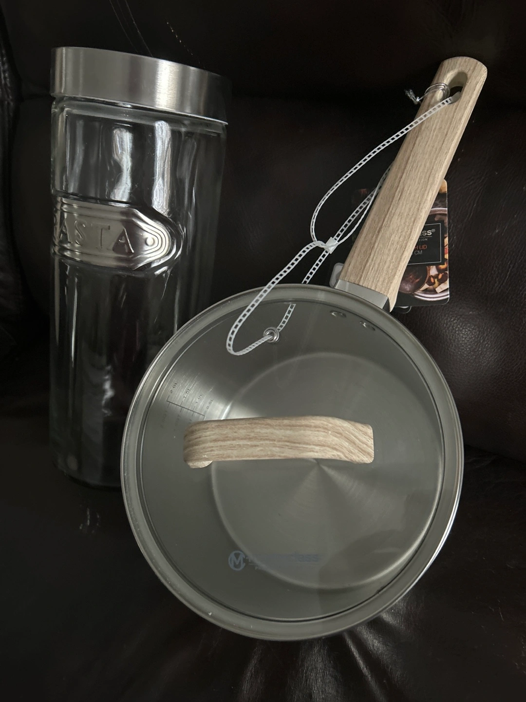 Stainless steel saucepan with lid. Features a wooden handle. 2.5 QT / 2.4 L . Includes glass pasta jar.