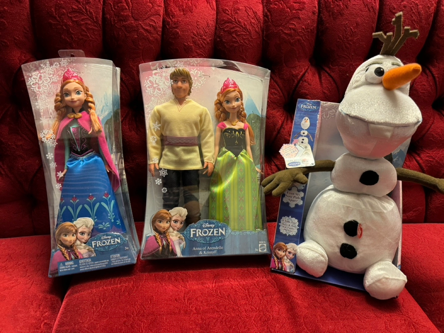 Three dolls from the movie Frozen. Anna, Kristoff, and Olaf. All dolls are in their original packaging. All items are brand new $50 for everything