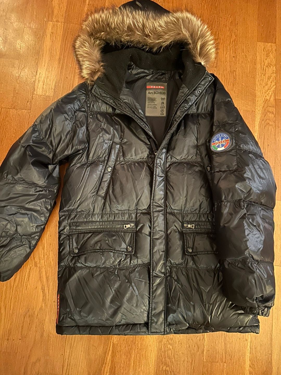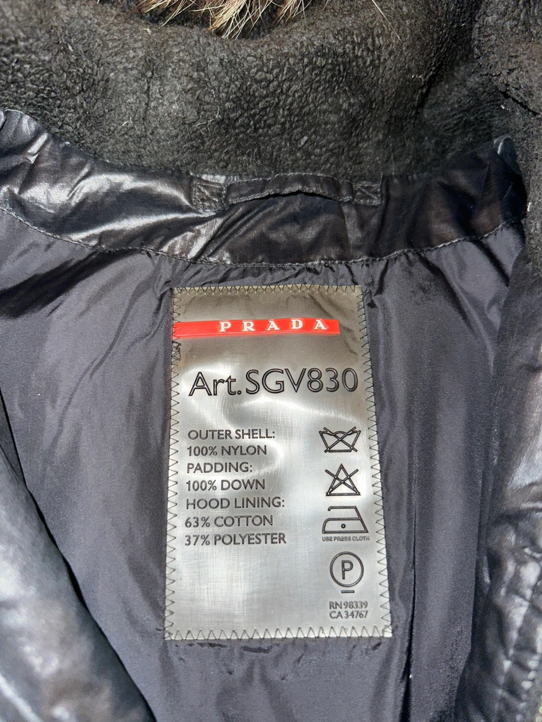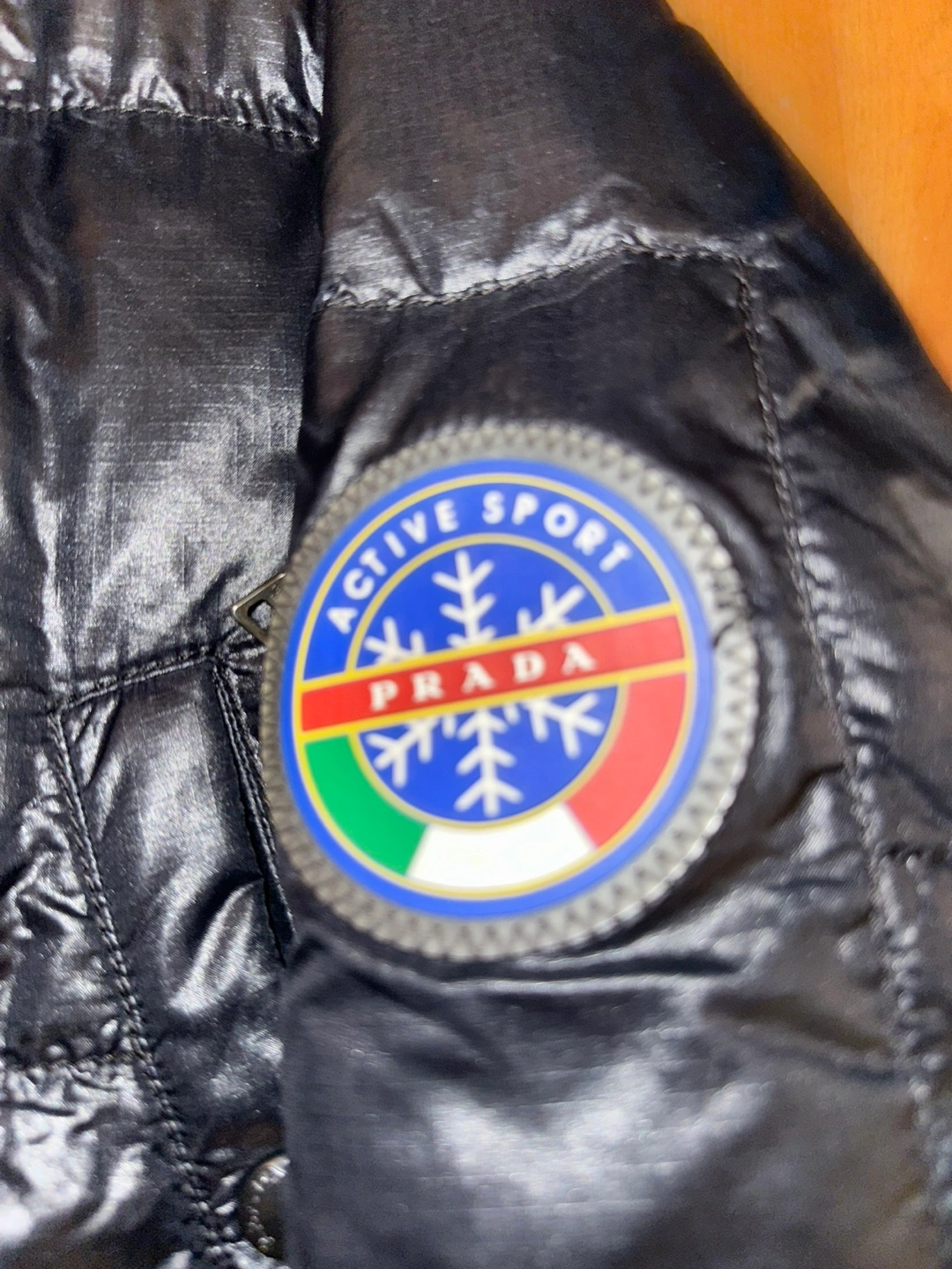 Black down jacket with a fur-lined hood. Features a patch on the sleeve with the Prada logo and the words Active Sport.