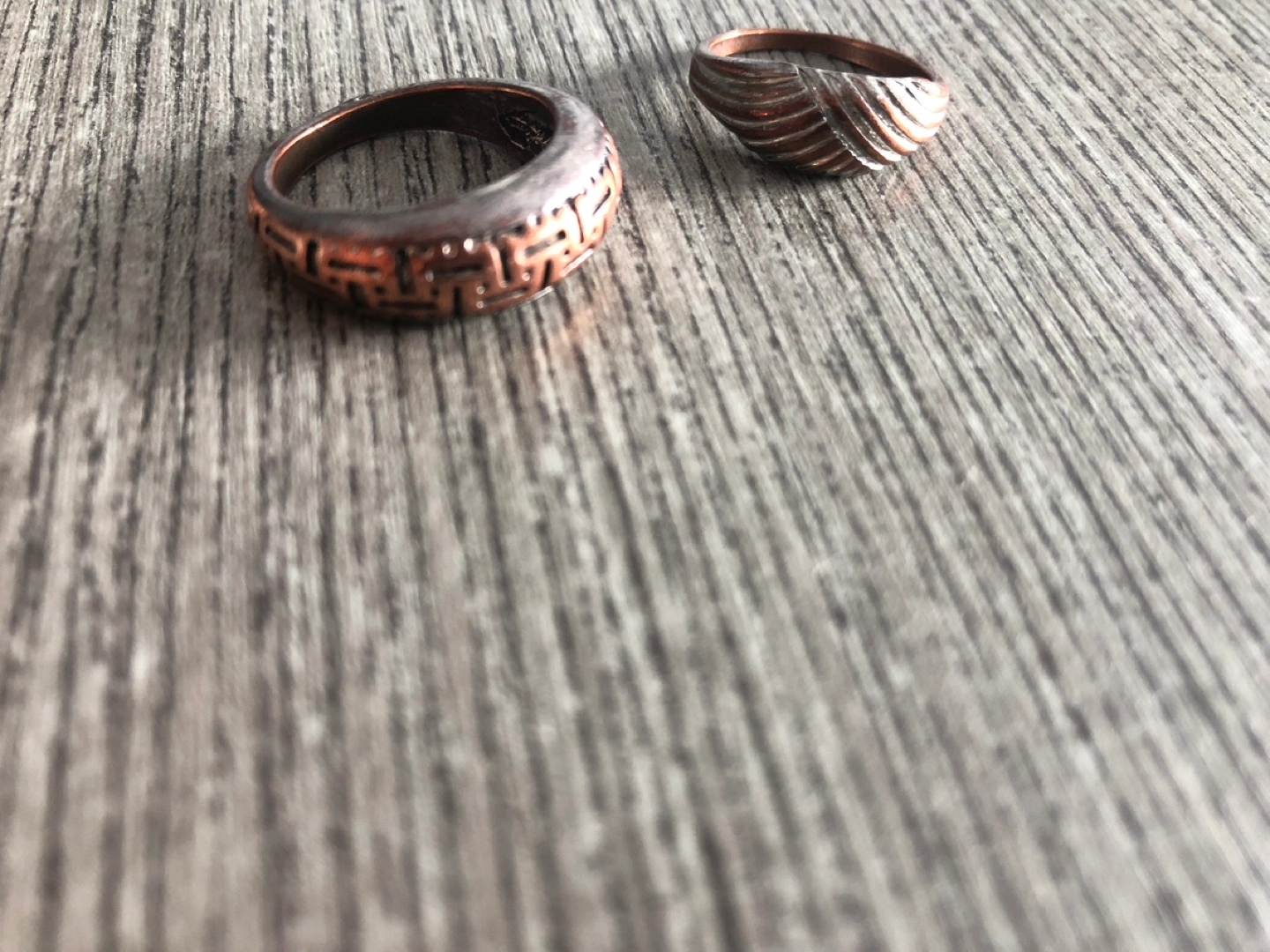 Set of 4 silver rings. Two are dainty with intricate designs, one is wider with a geometric design.