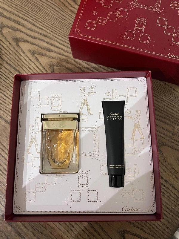 CARTIER La Panthère Gift Set Comes in beautiful bag with Cartier ornament Brand new and authentic Cartier’s captivating La Panthère perfume is the signature scent of the free-spirited, passionate woman. In this sparkling floral fragrance, the radiant and delicate gardenia comes together with velvety notes of musk. This gift set features a 50ml La Panthère perfume and matching 40ml hand cream so you can truly be immersed in this iconic fragrance. In a special festive box, it arrives ready for festive gifting.