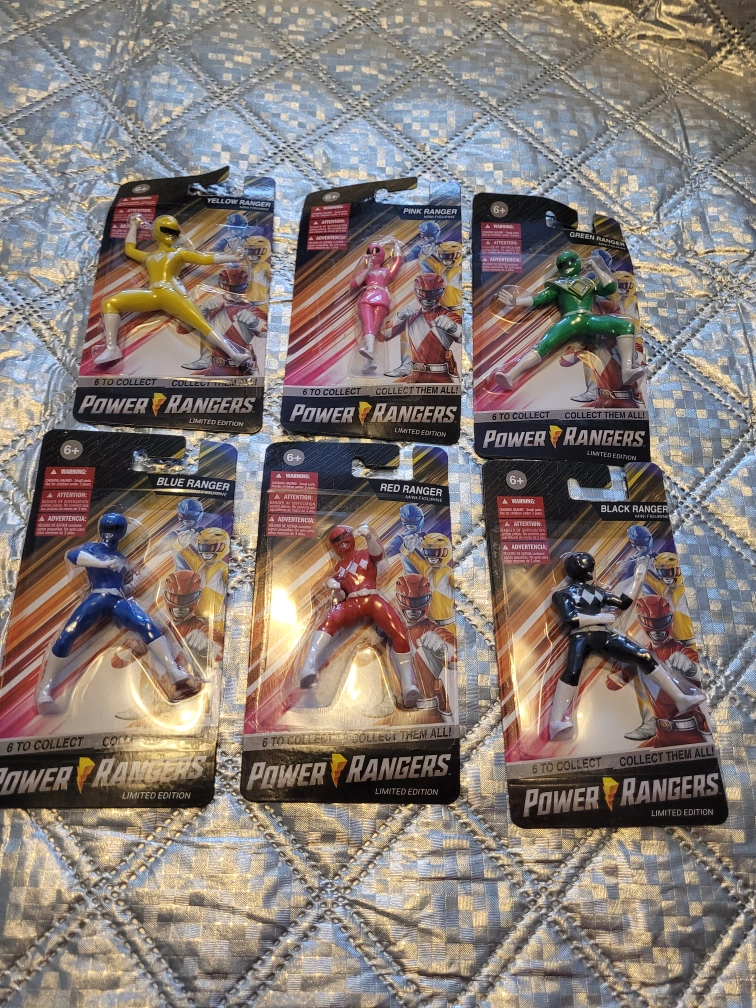 This Limited Edition Power Rangers Set of 6 Officially Licensed Power Rangers Mini Figures 2.5" (6.5cm) has: 1 x Black Ranger 1 x Blue Ranger 1 x Green Ranger 1 x Pink Ranger 1 x Red Ranger 1 x Yellow Ranger Age 6 and up Price $20.00 cash Amazon $17.95 TWIN Pack (Pink & Black Rangers)