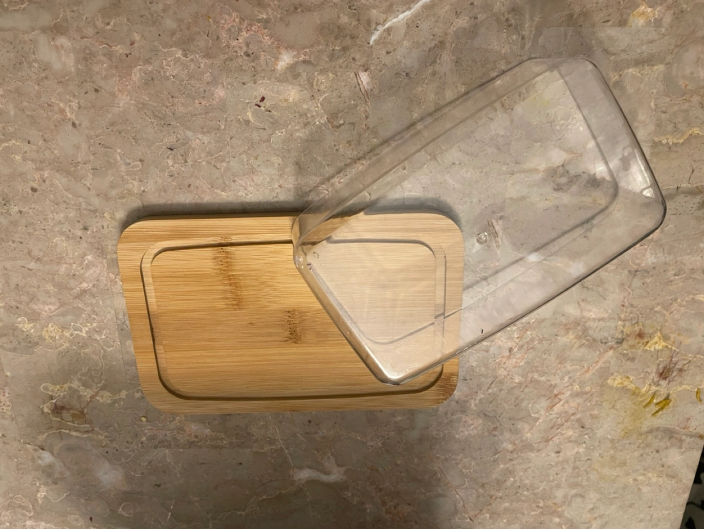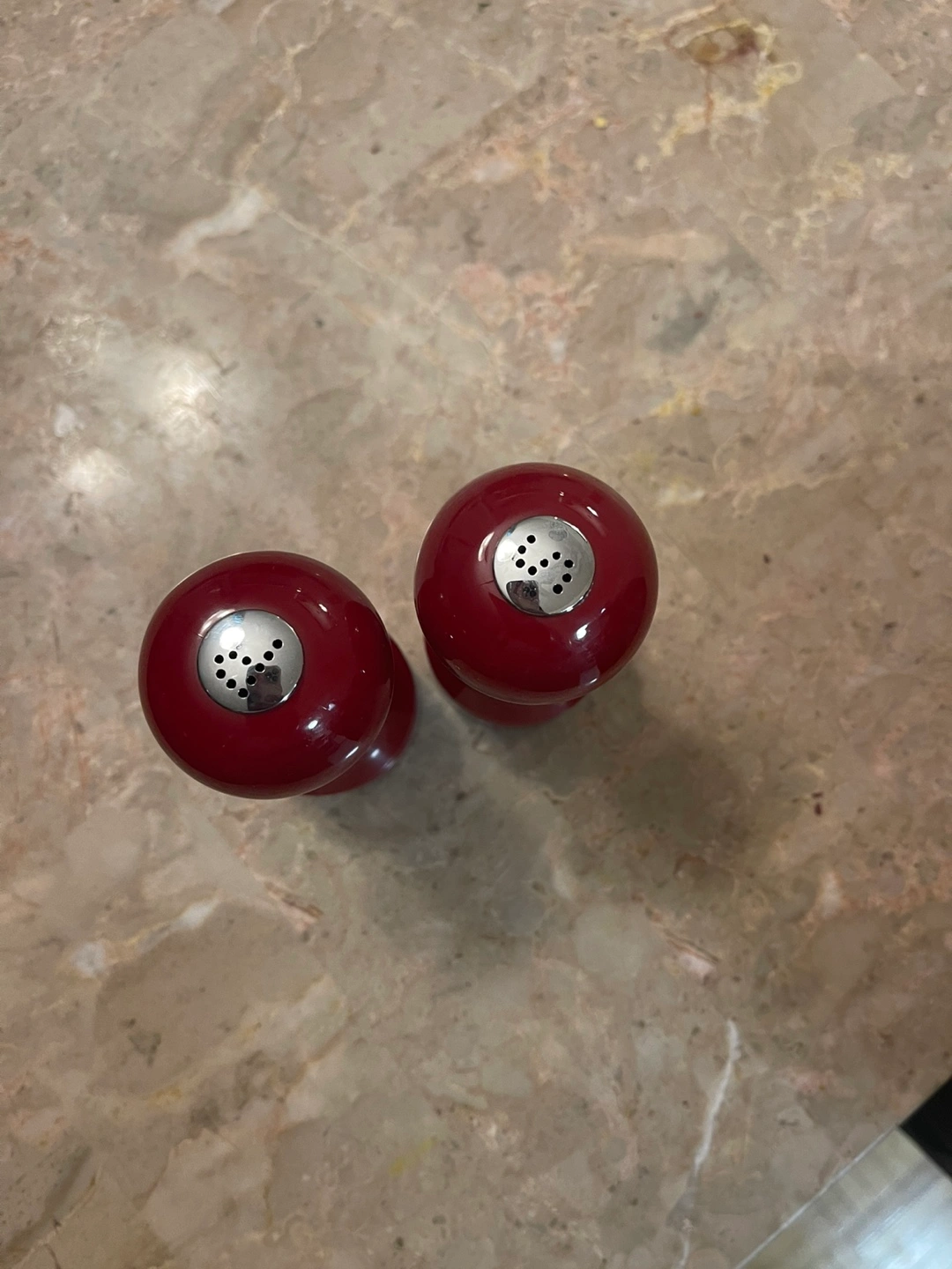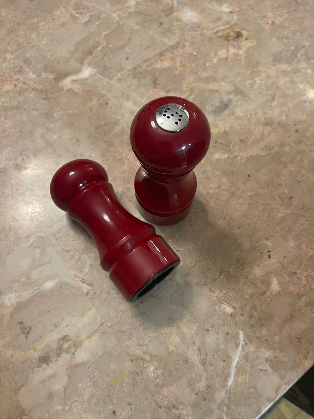 Red salt and pepper shakers and a clear butter dish with a bamboo base.