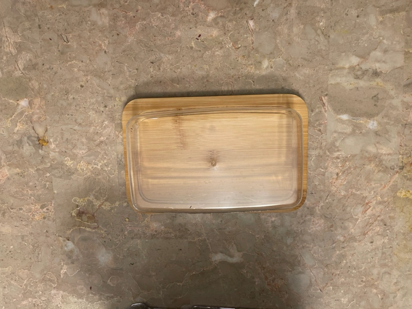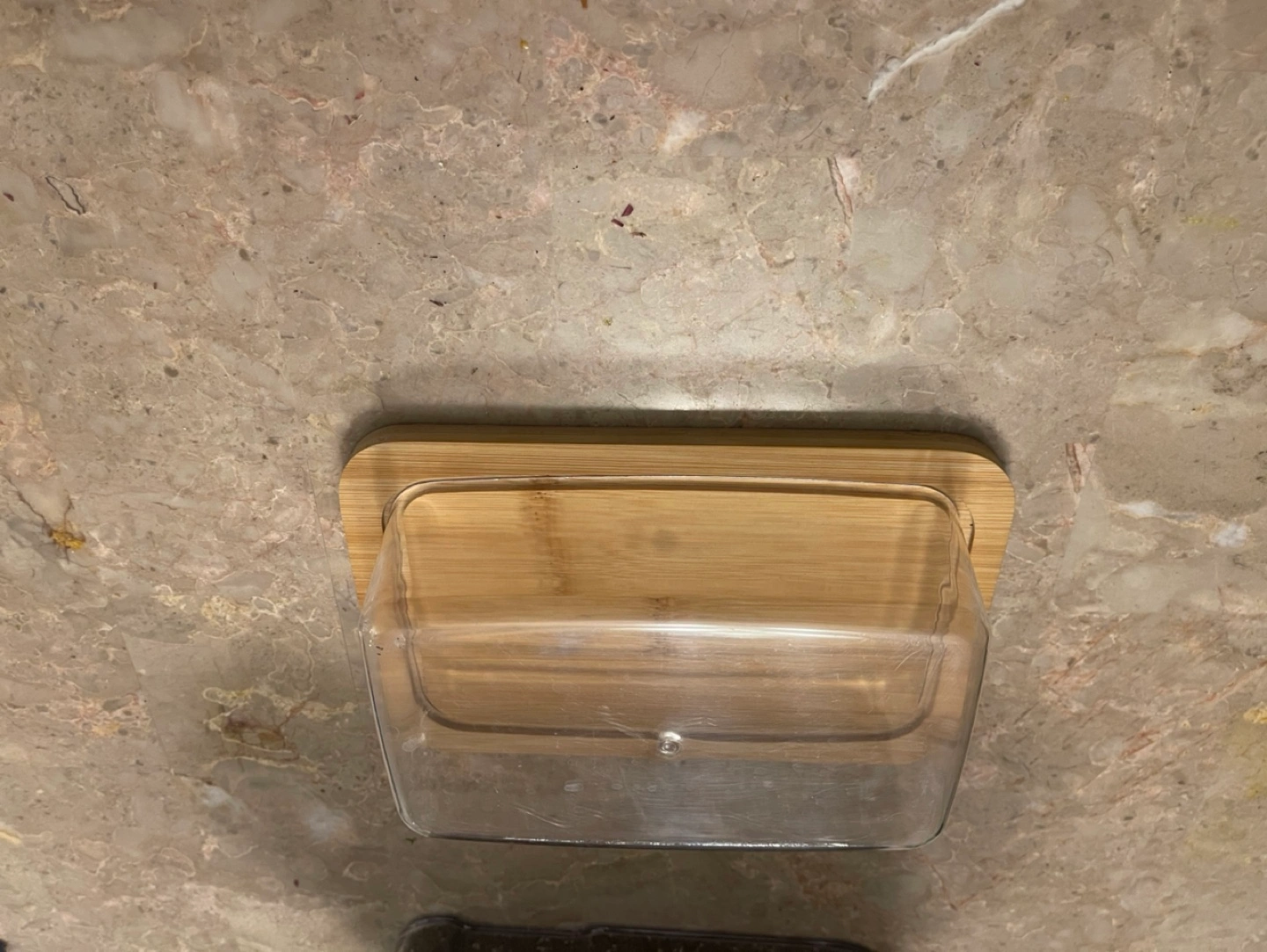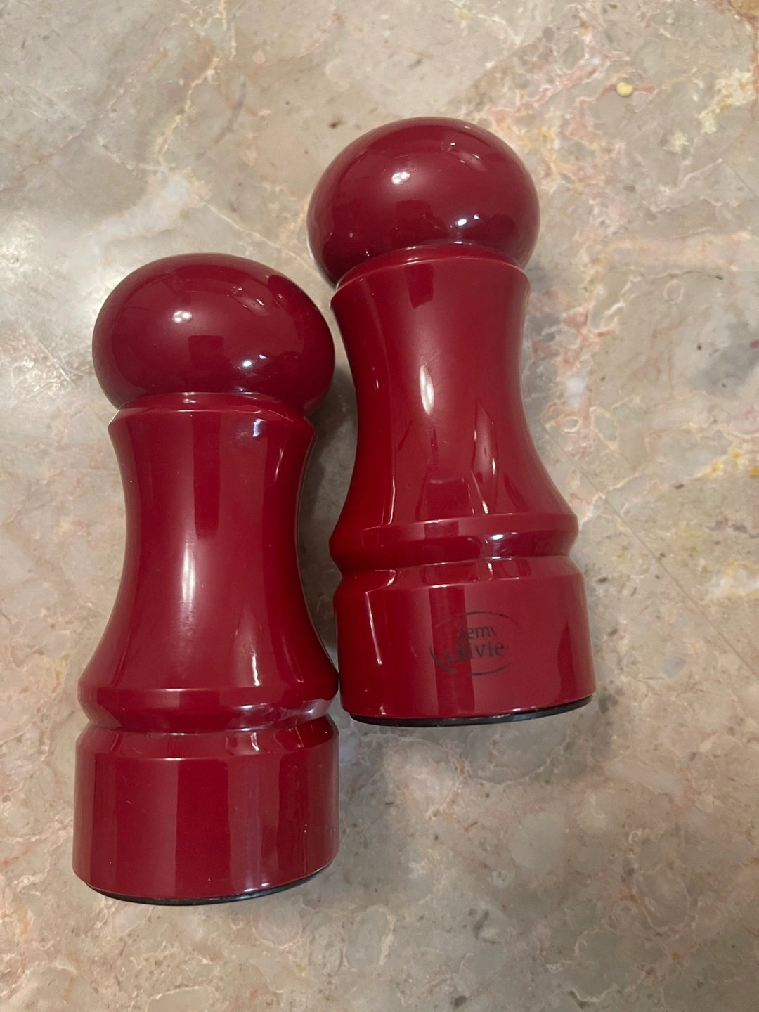 Red salt and pepper shakers and a clear butter dish with a bamboo base.